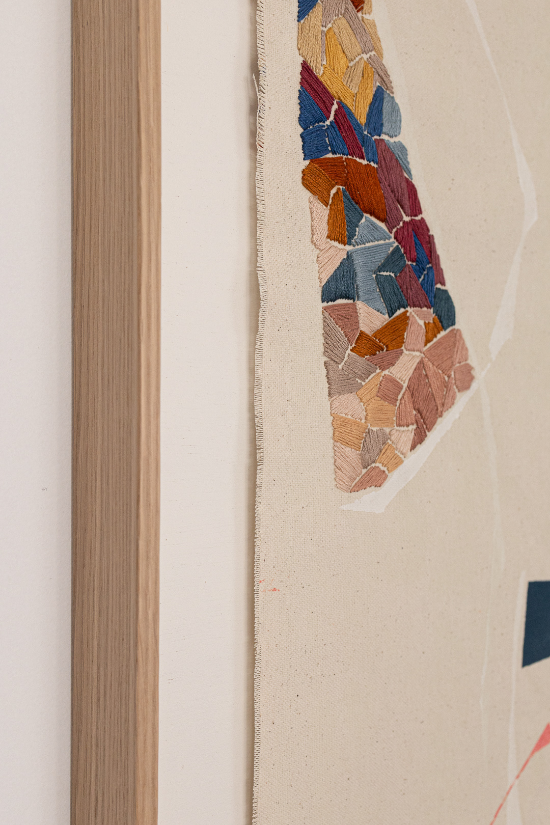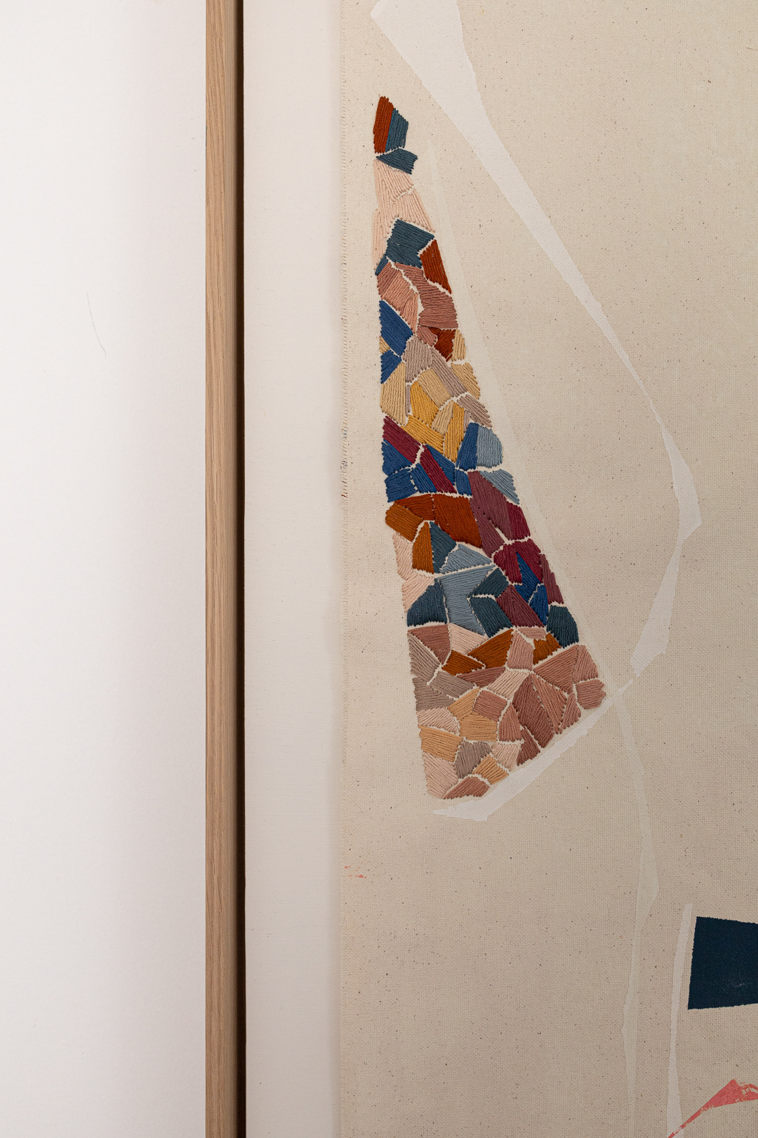 Tinta acrílica, têmpera vinílica e bordados com fios de algodão sobre estopa de linho.