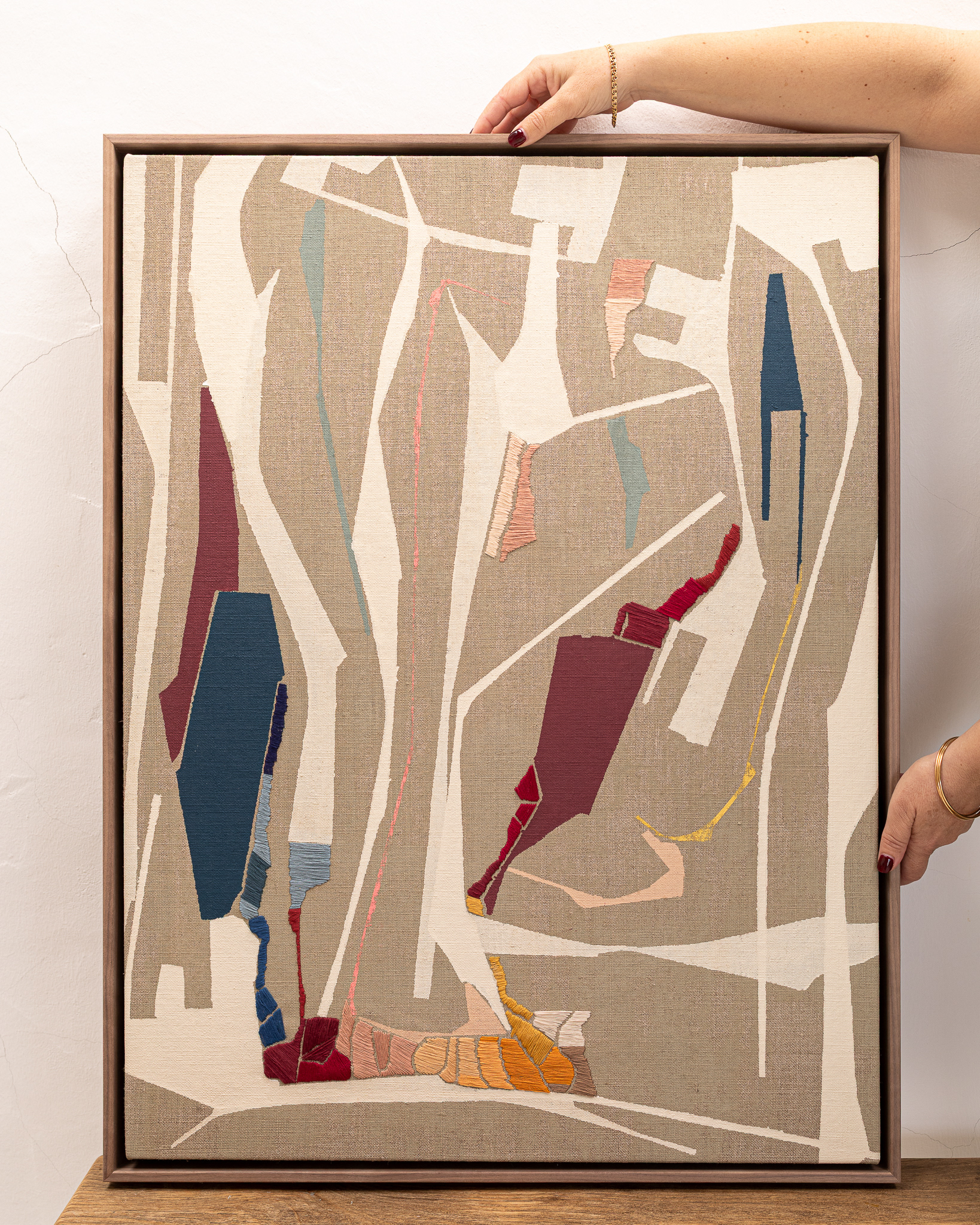 Tinta acrílica, têmpera vinílica e bordados com fios de algodão sobre linho esticado em grade de madeira.