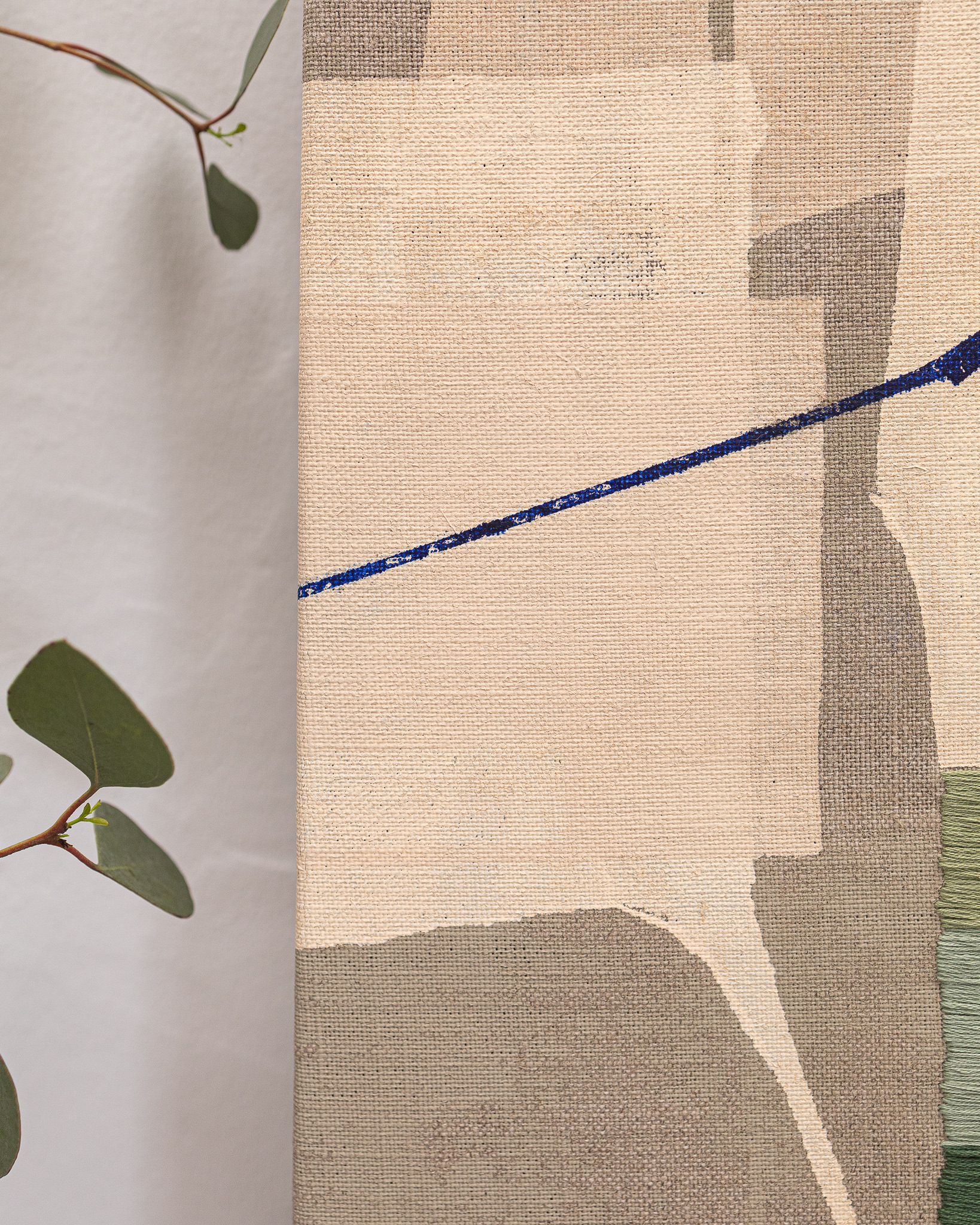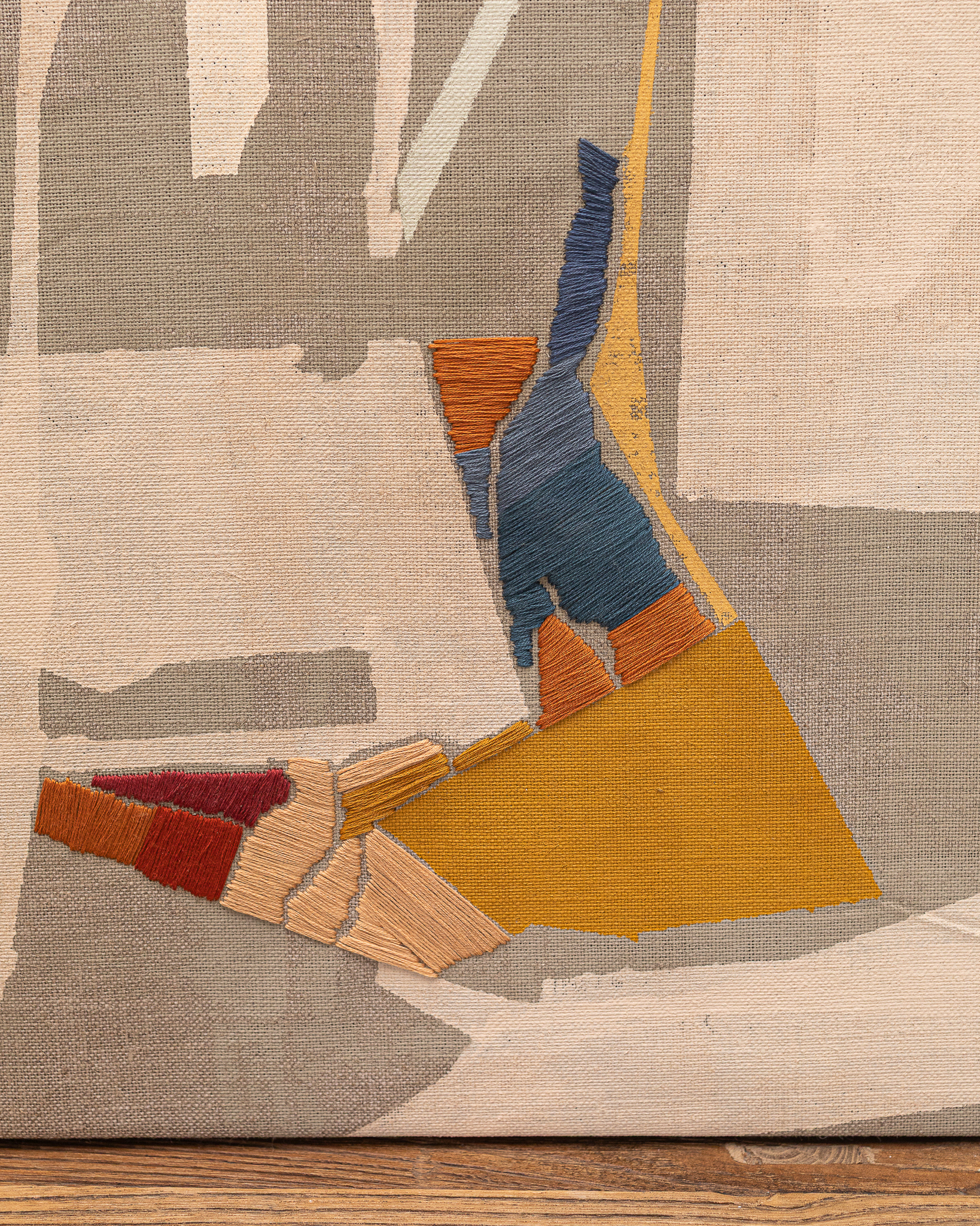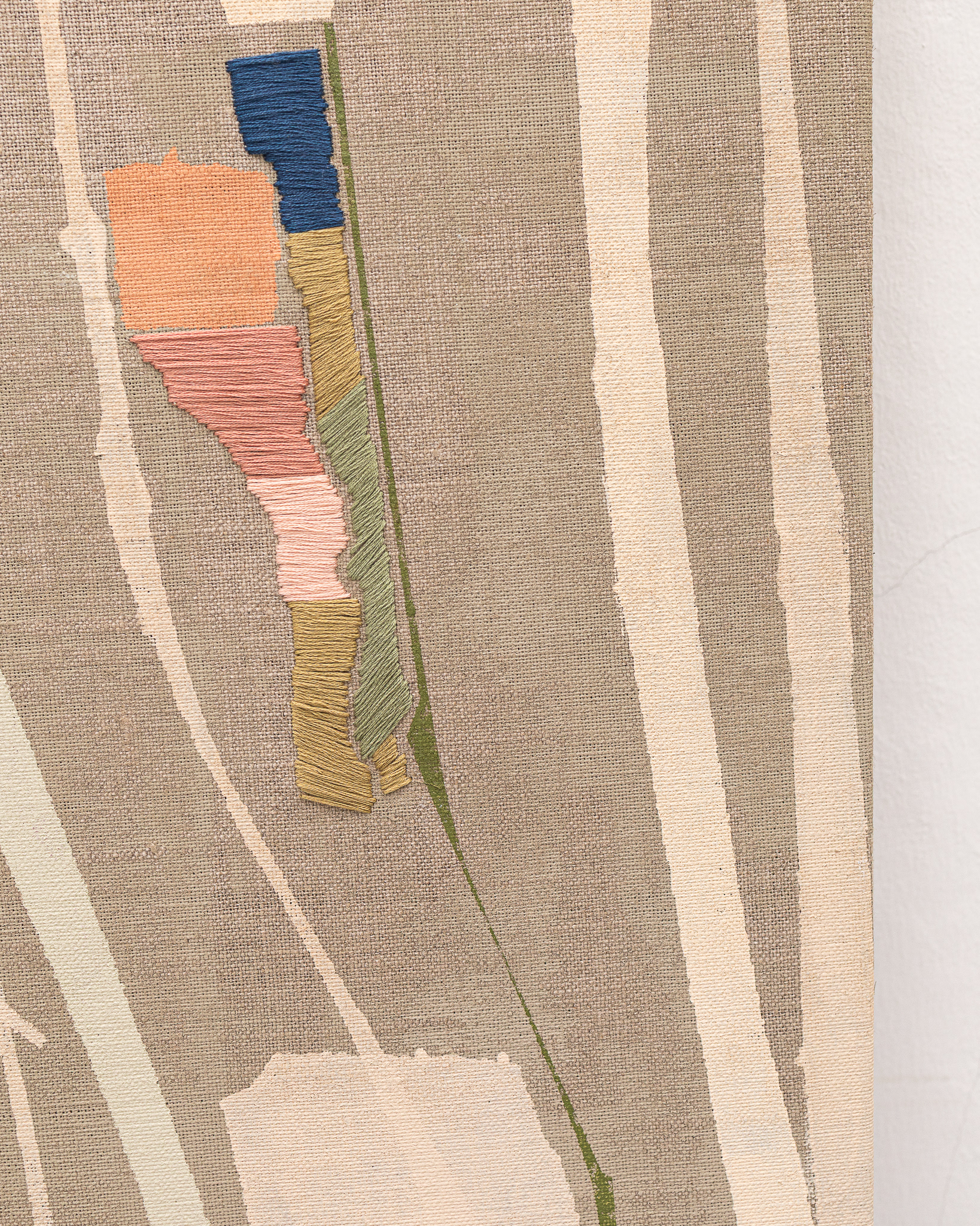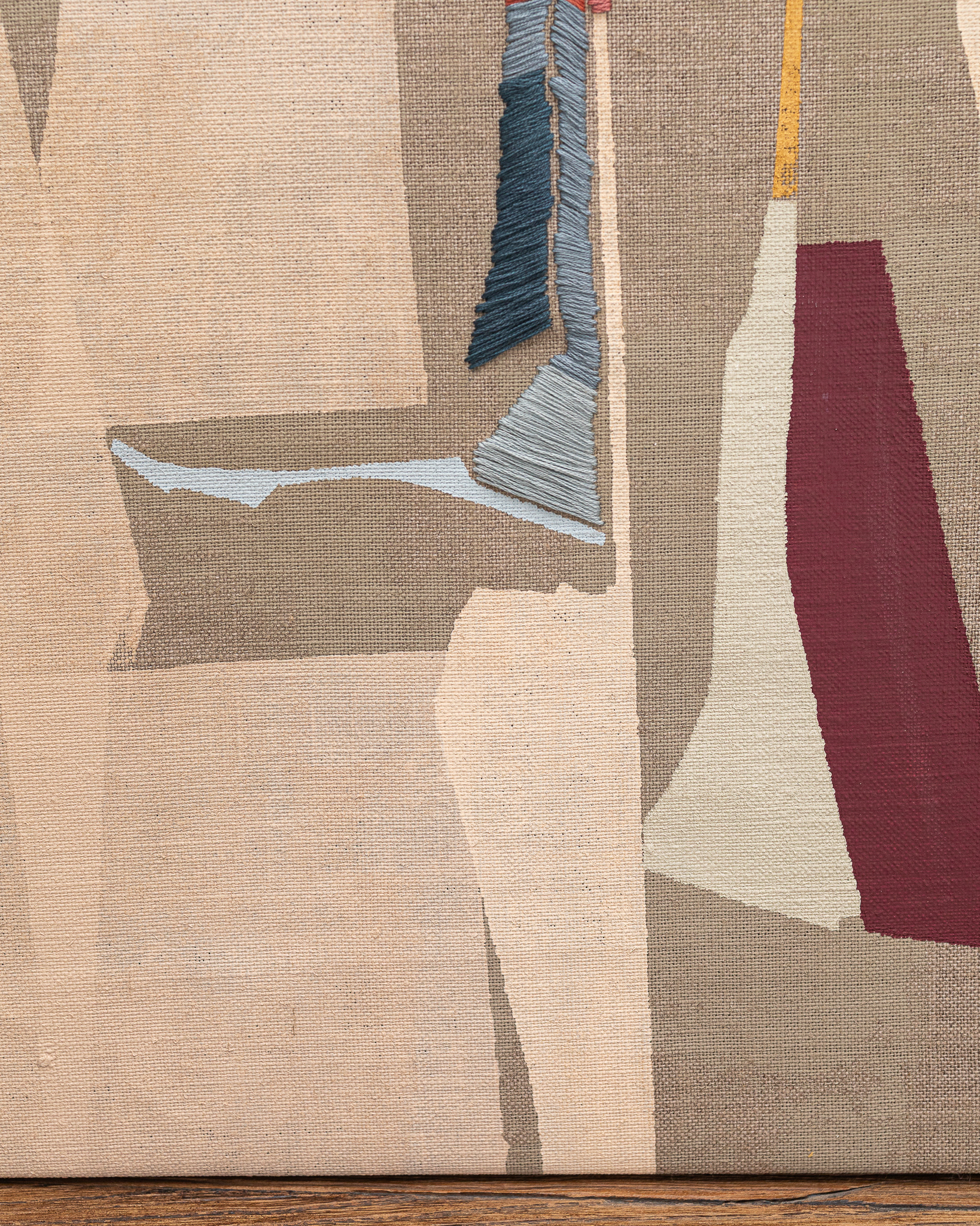 Tinta acrílica, têmpera vinílica e bordados com fios de algodão sobre linho esticado em grade de madeira.