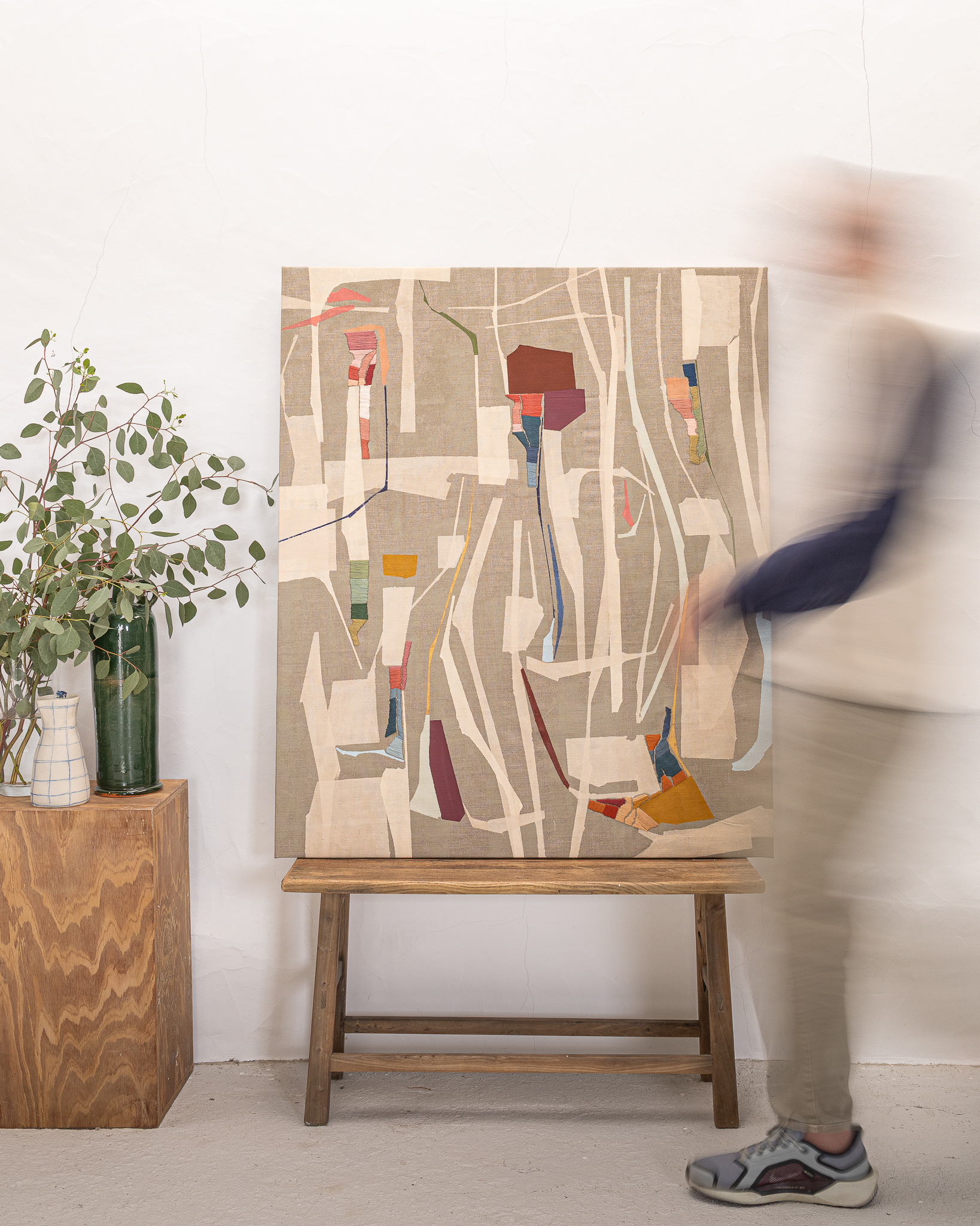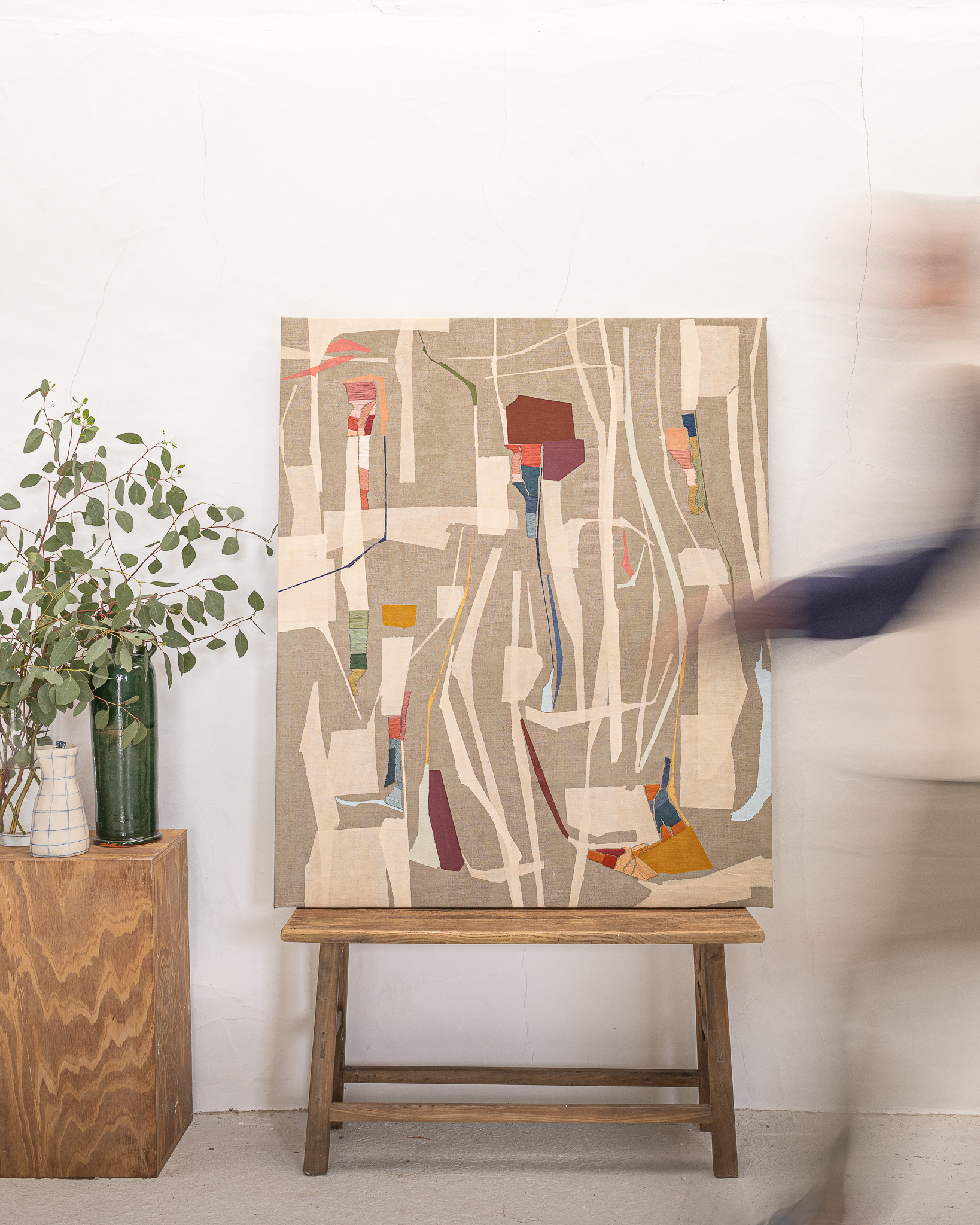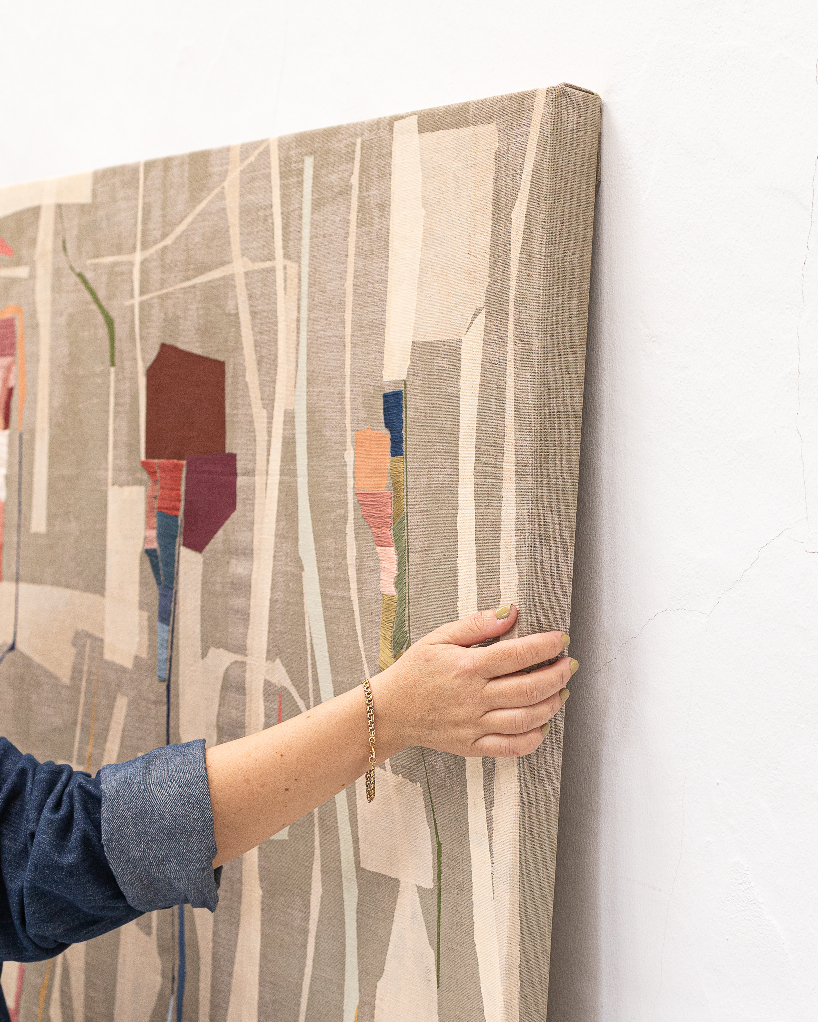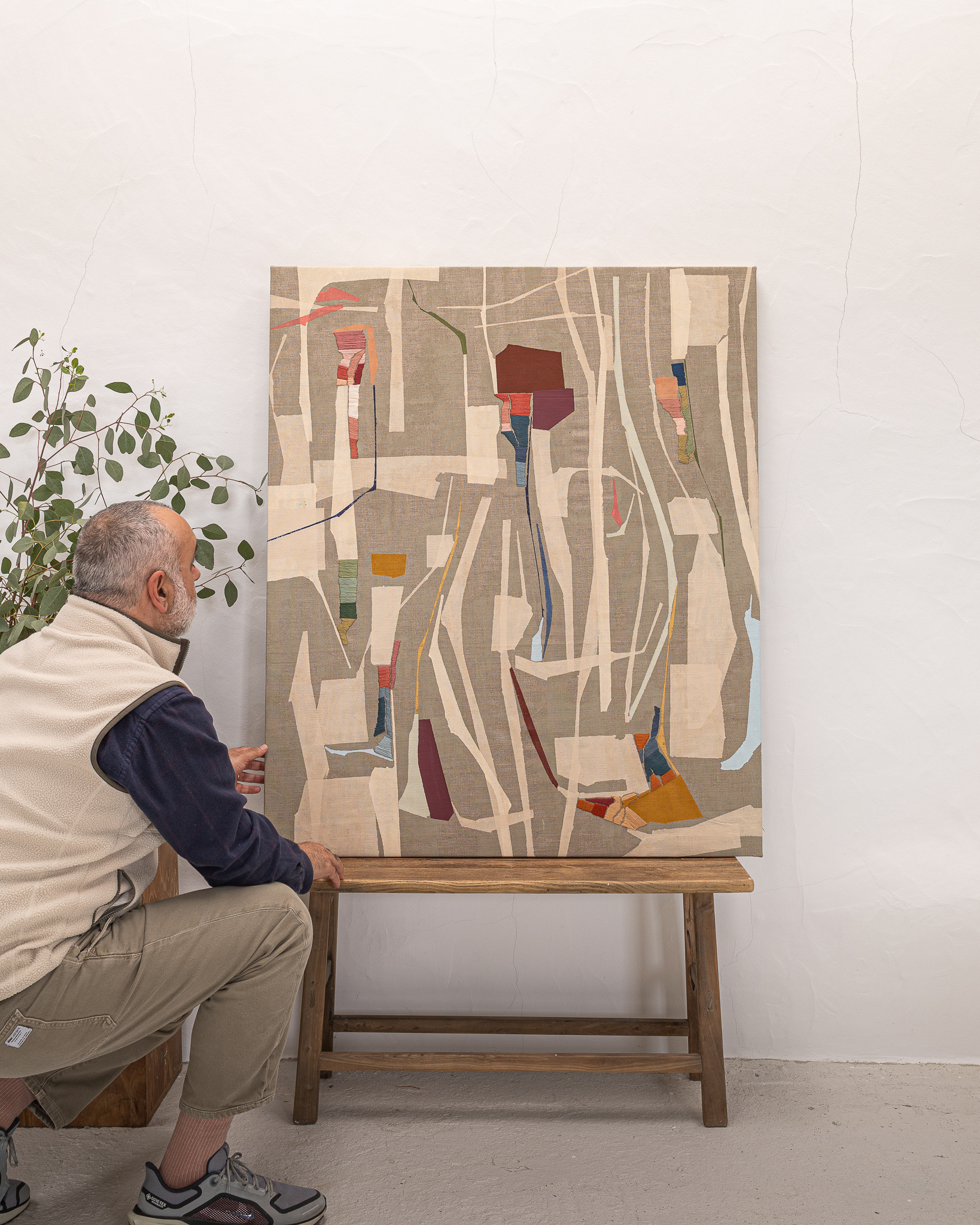 Tinta acrílica, têmpera vinílica e bordados com fios de algodão sobre linho esticado em grade de madeira.