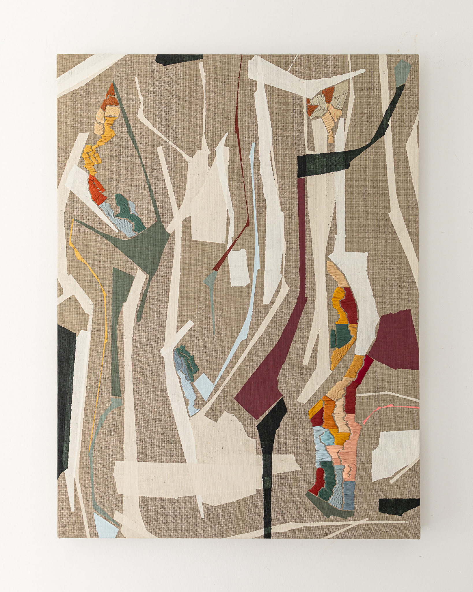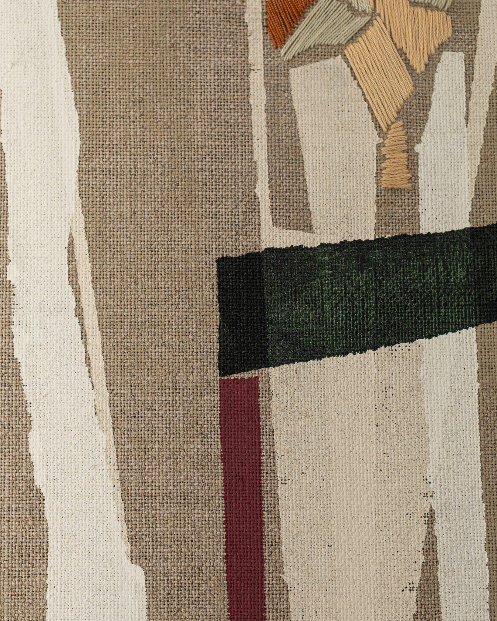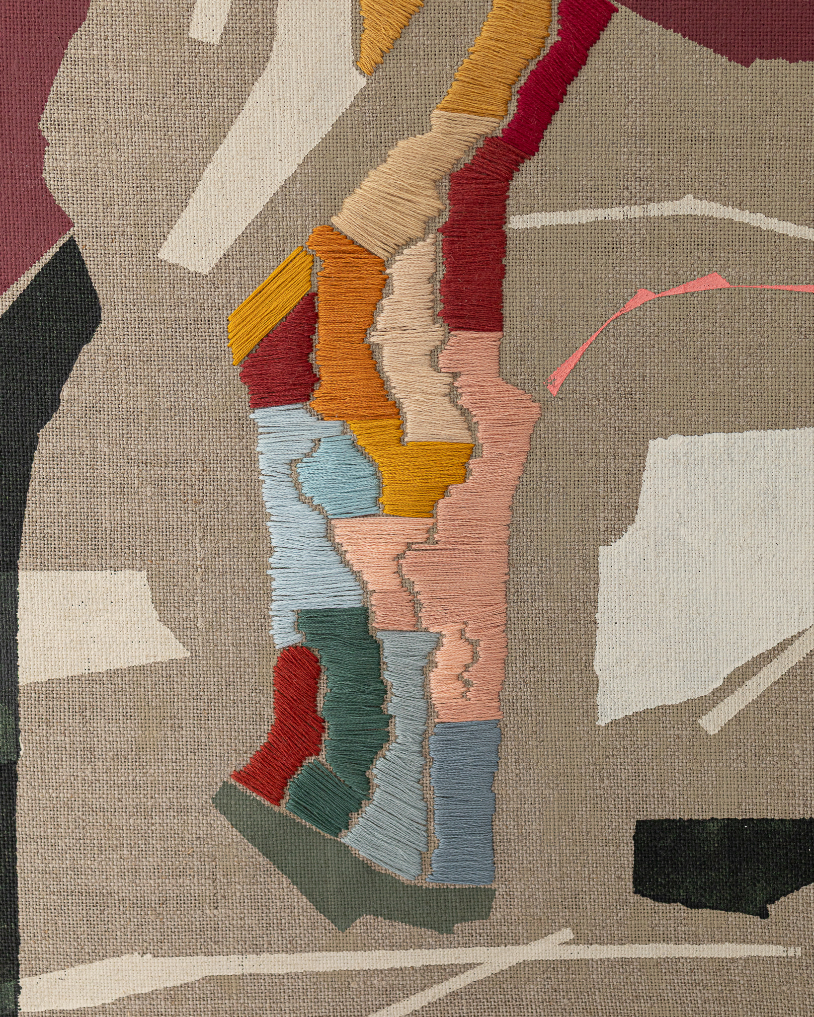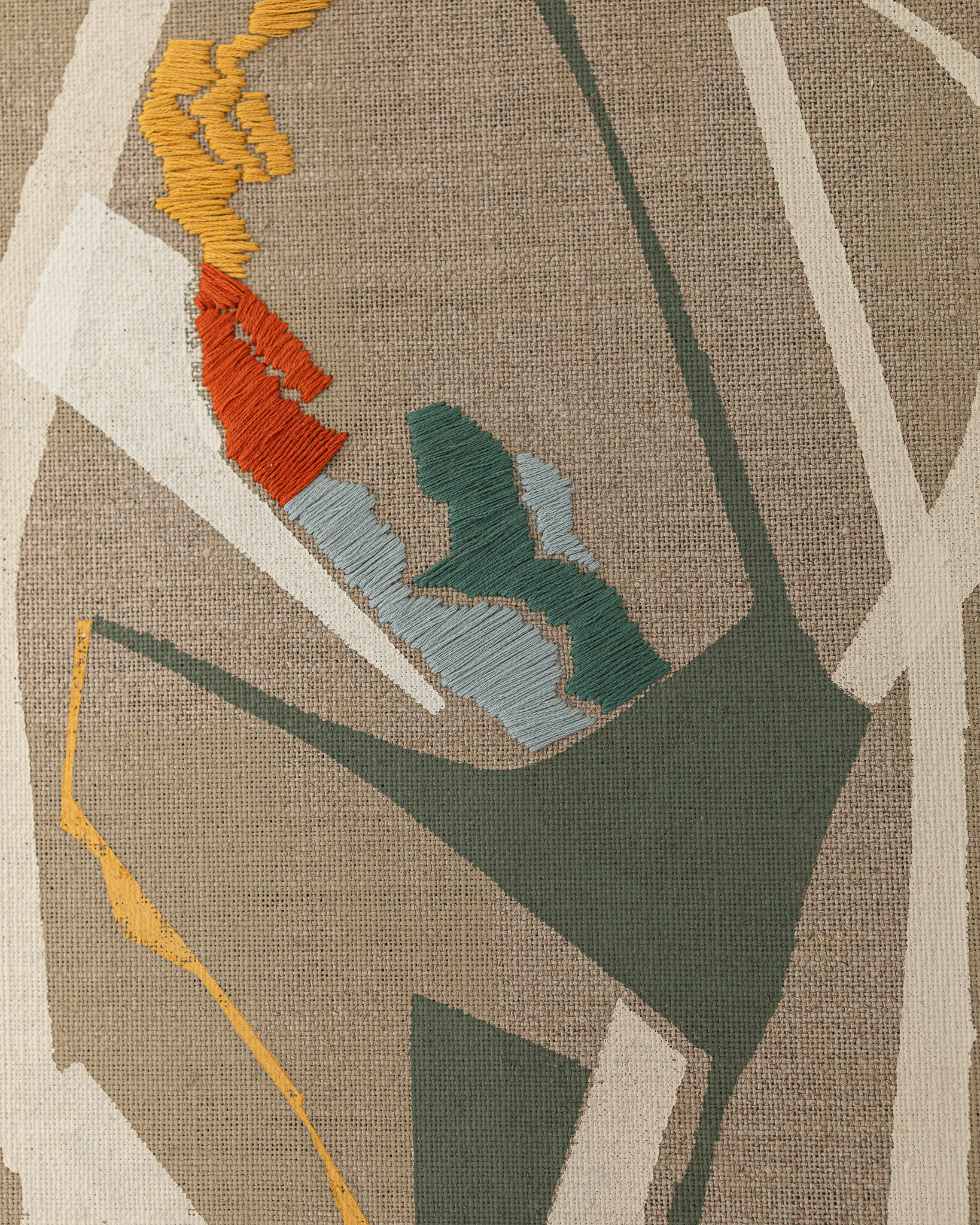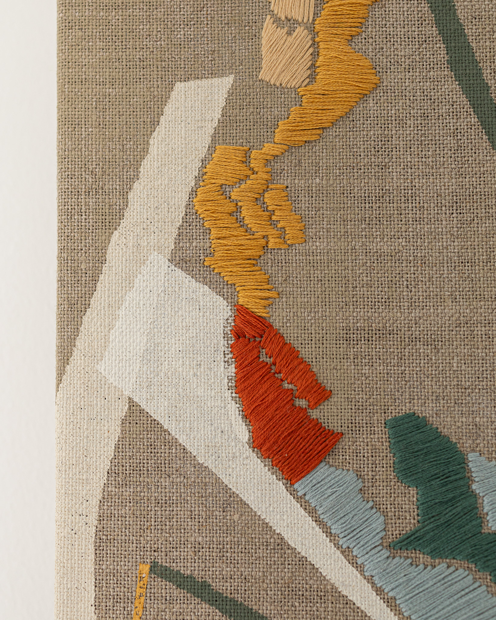 Tinta acrílica, têmpera vinílica e bordados com fios de algodão sobre linho esticado em grade de madeira.