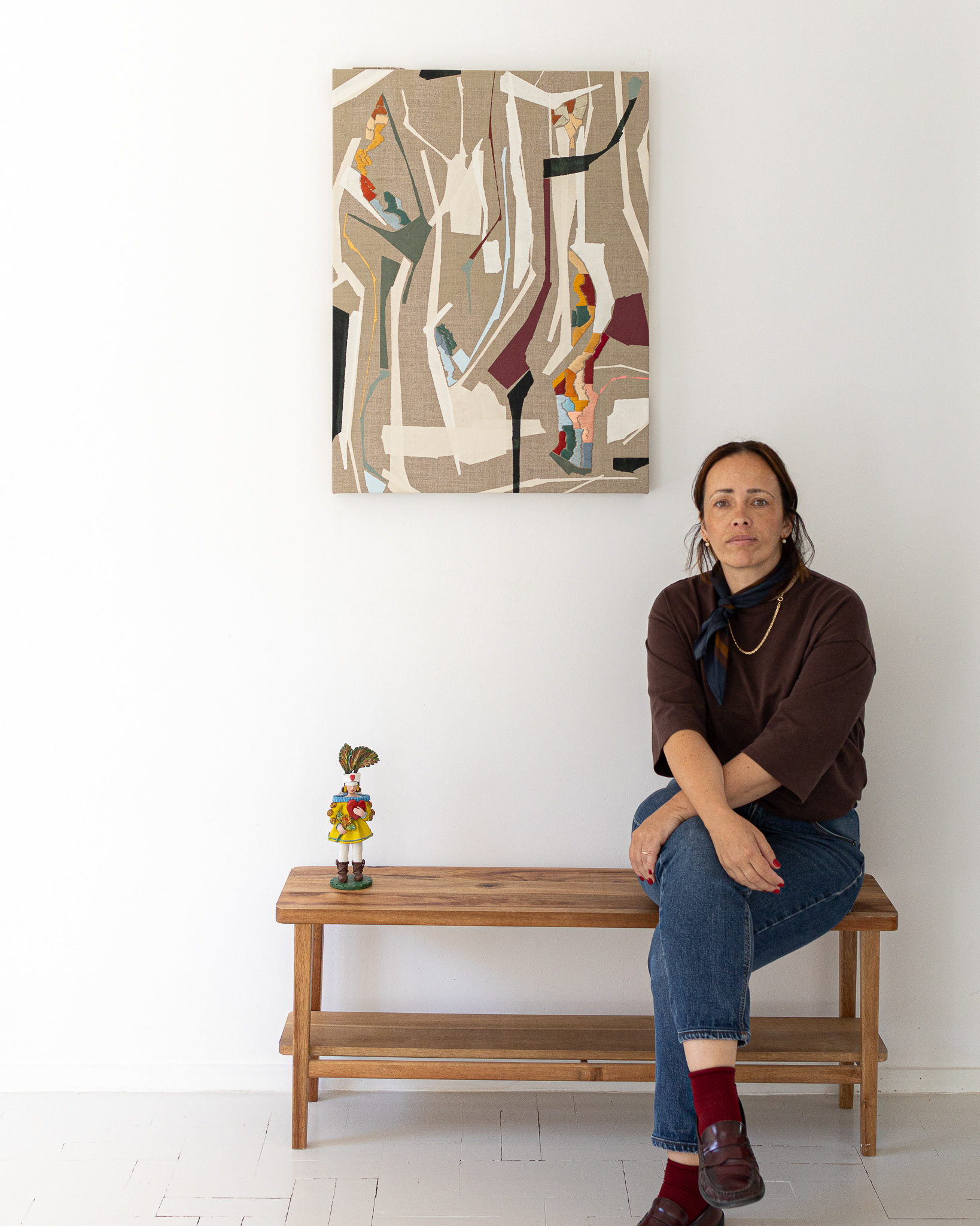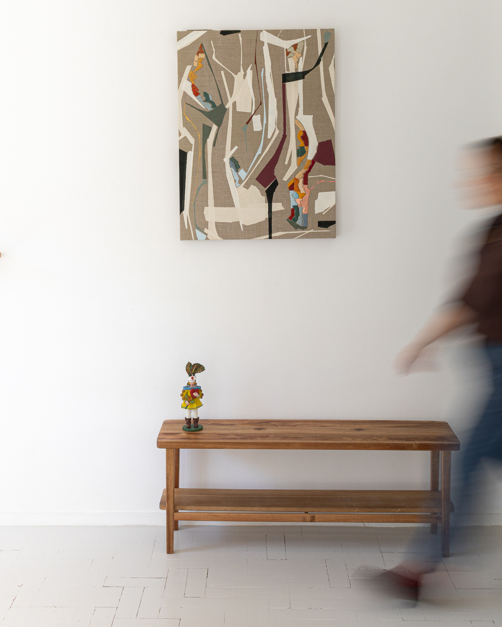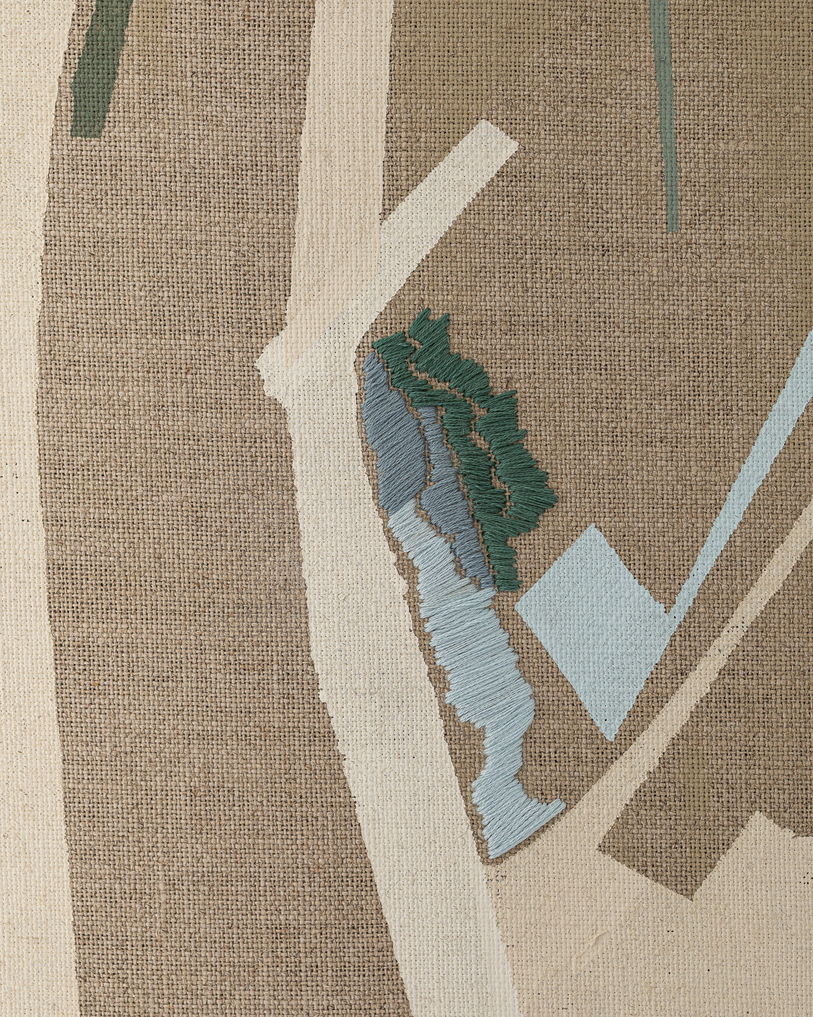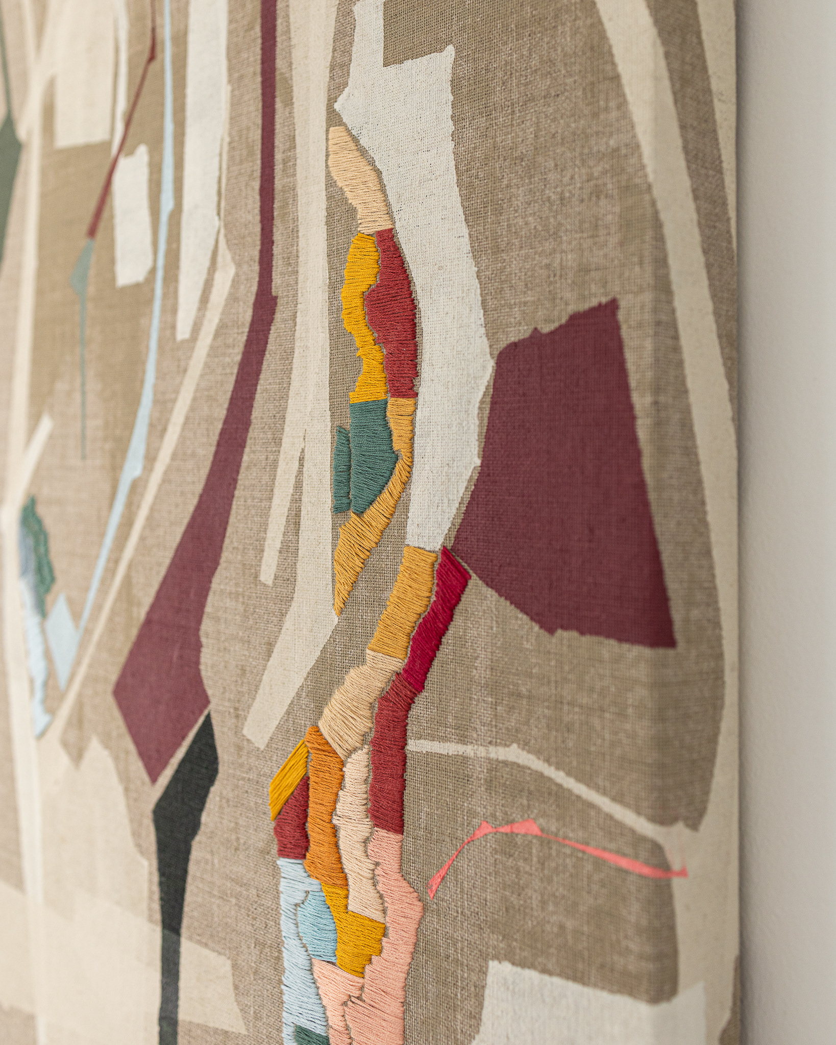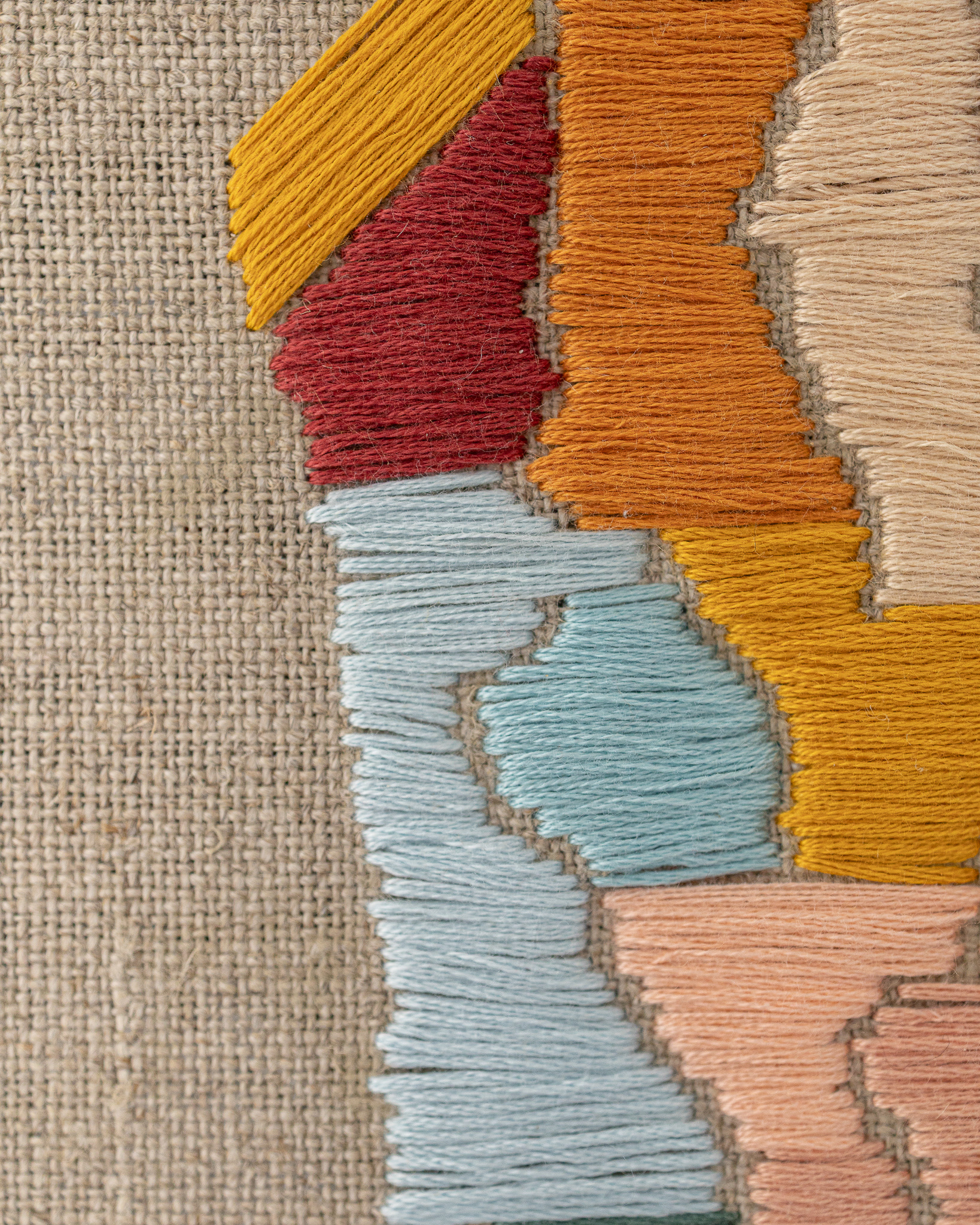Tinta acrílica, têmpera vinílica e bordados com fios de algodão sobre linho esticado em grade de madeira.