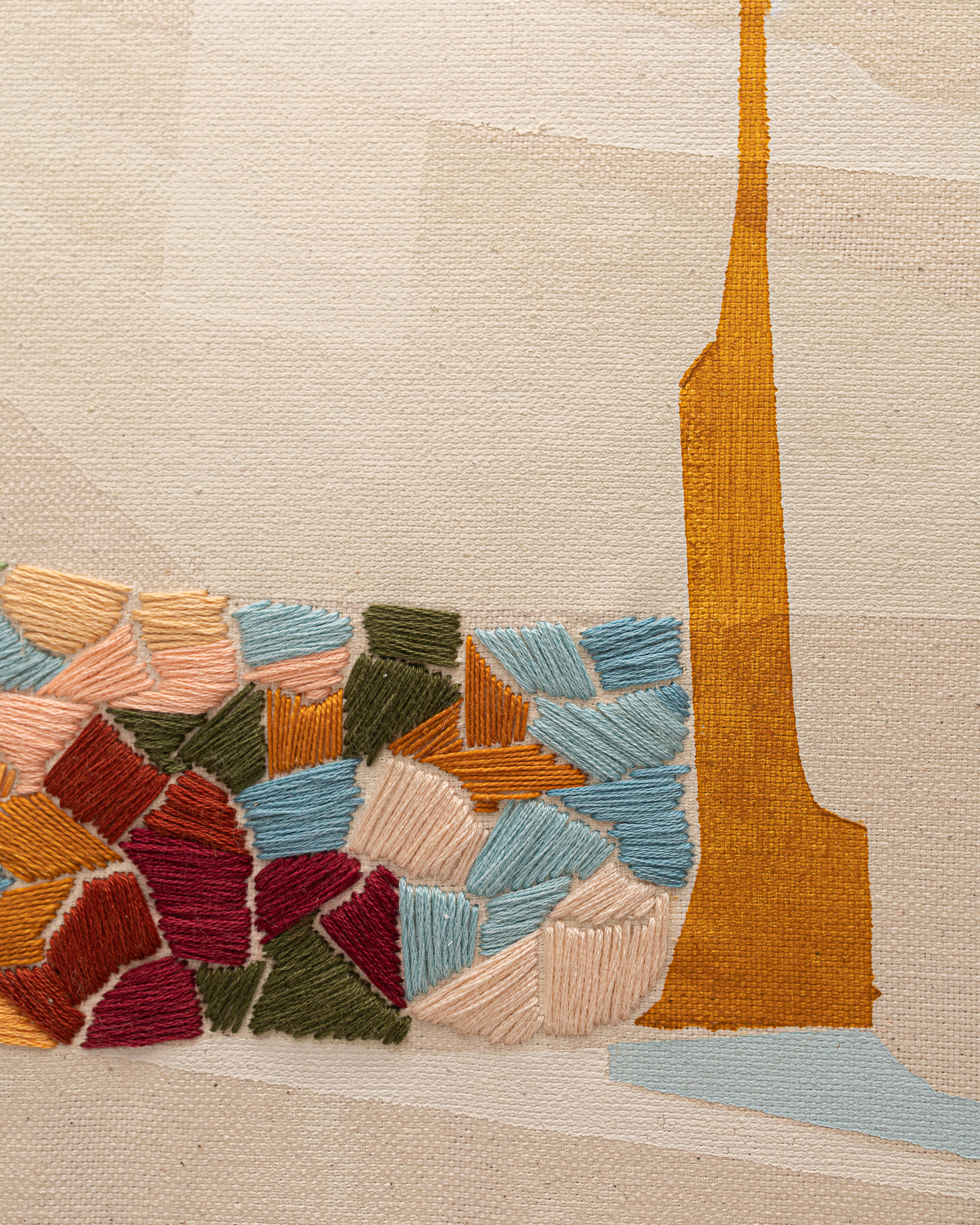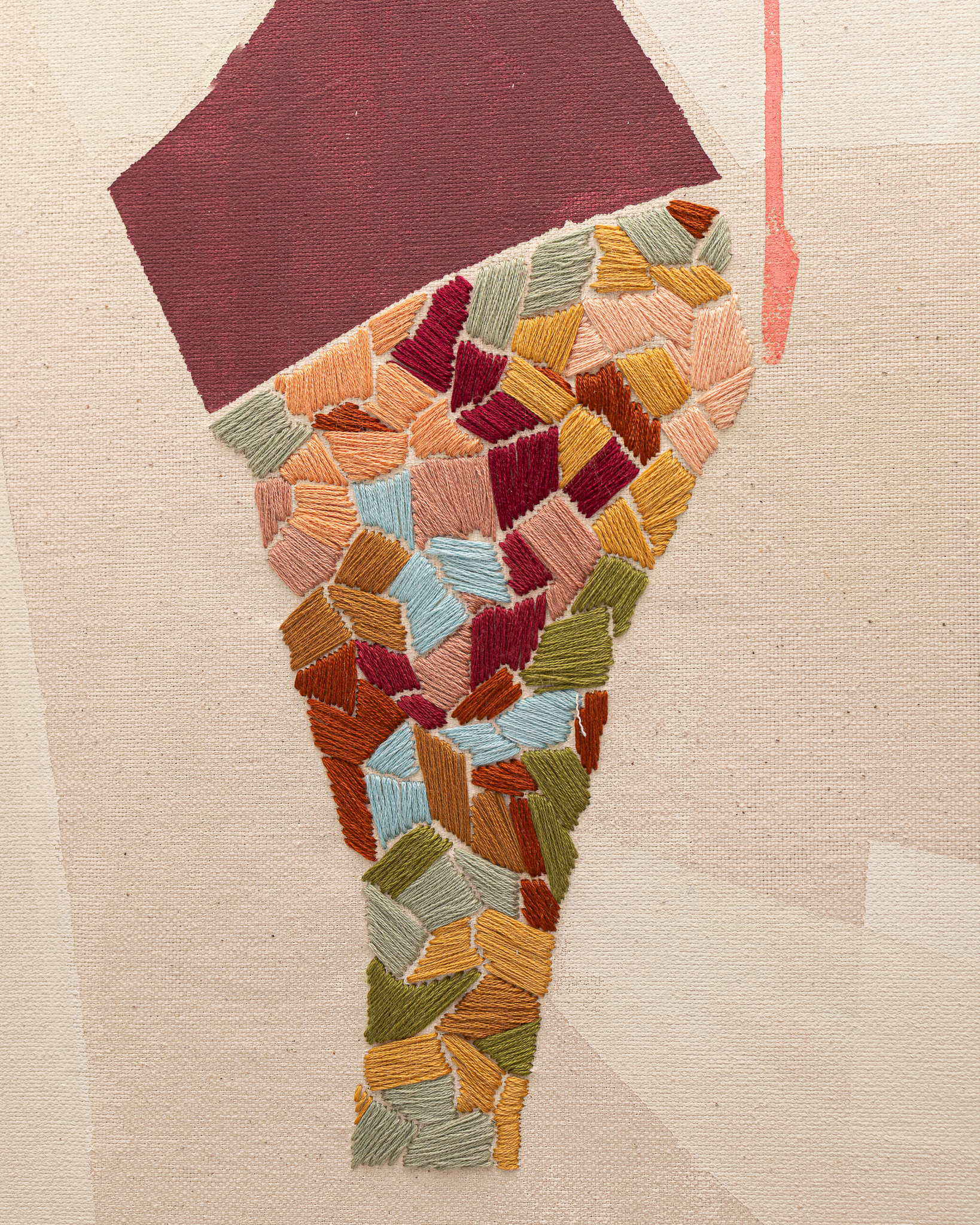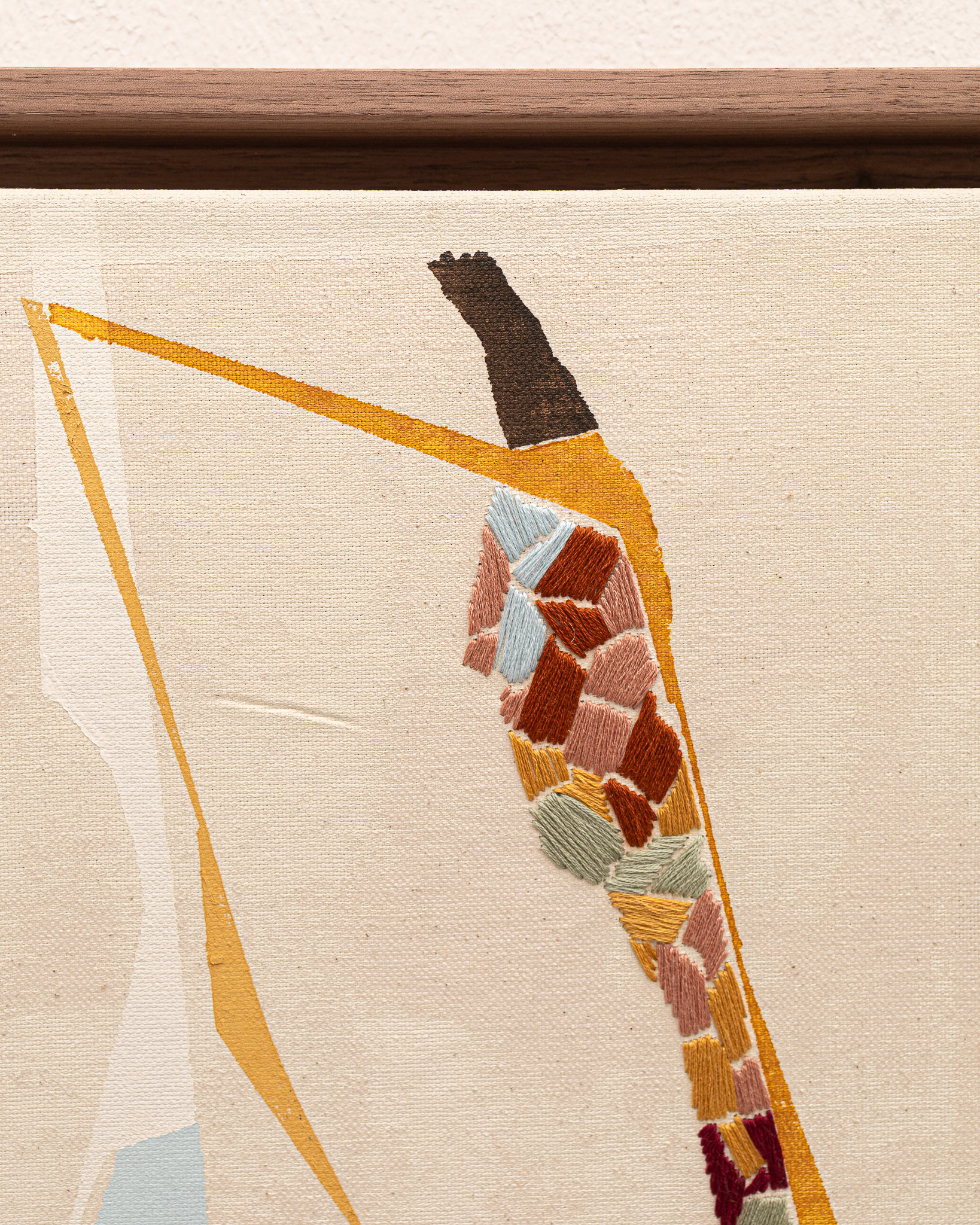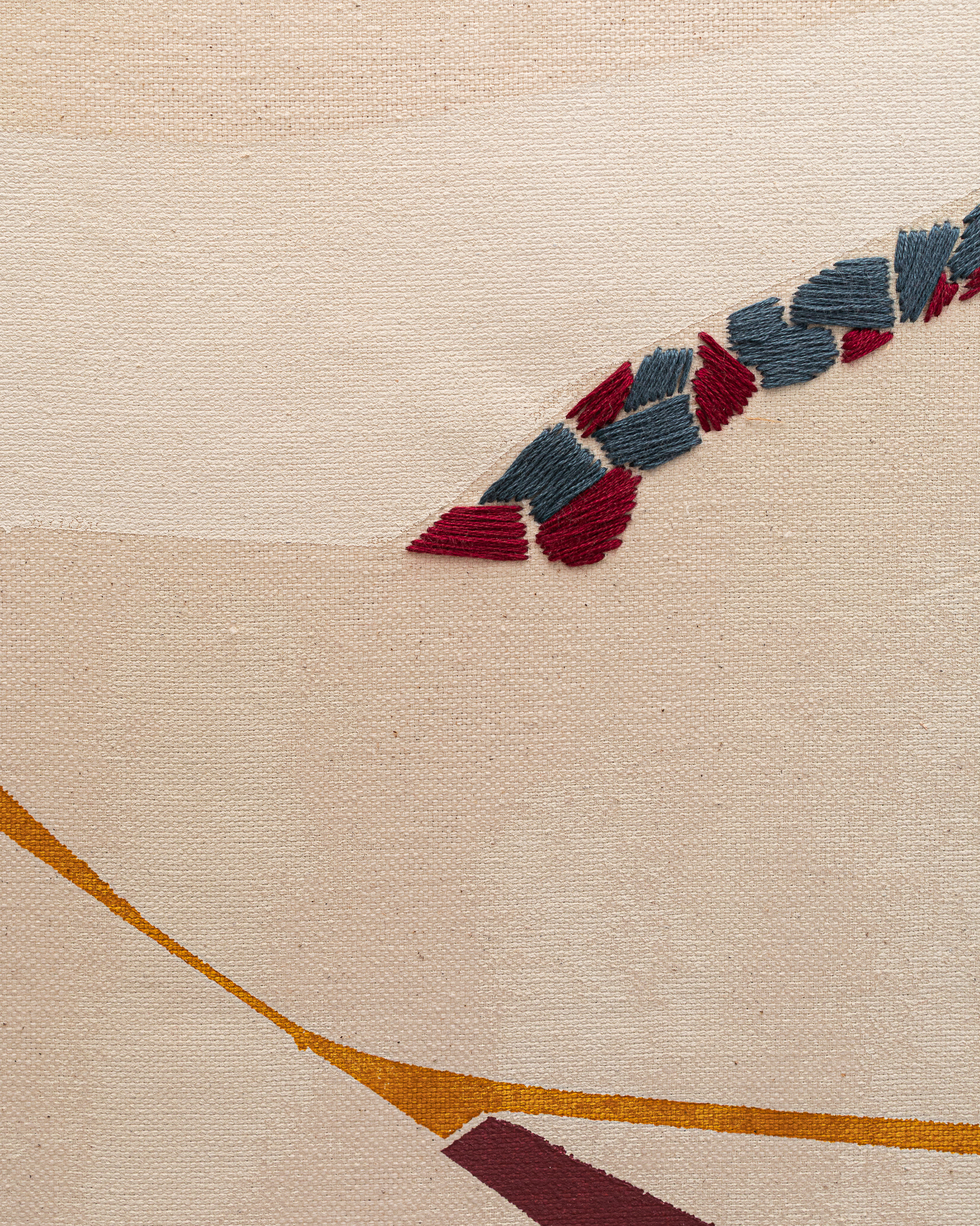 Tinta acrílica, têmpera vinílica e bordados com fios de algodão sobre linho esticado em grade de madeira.