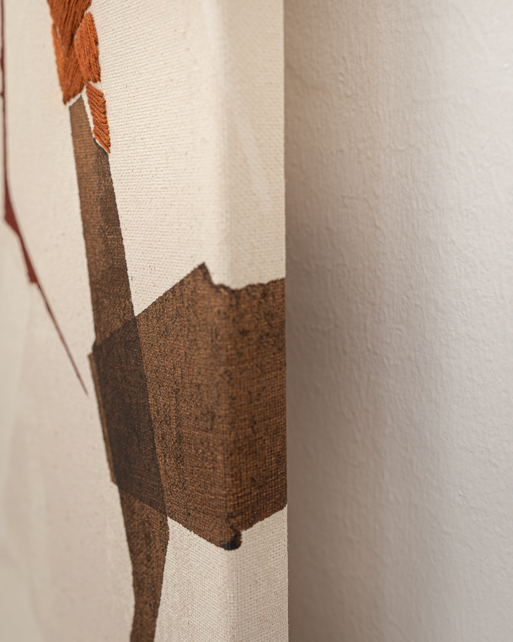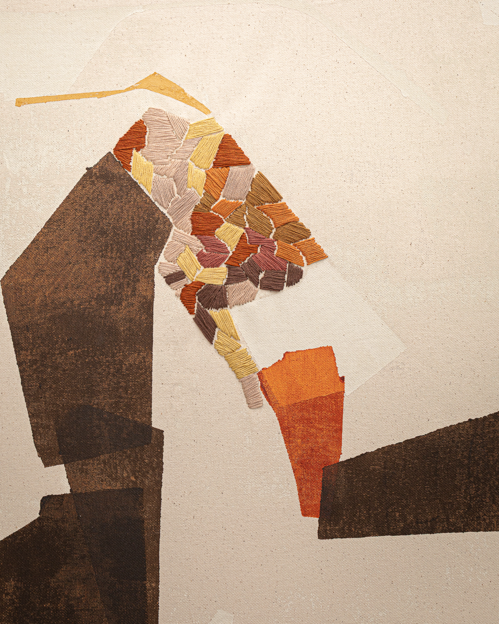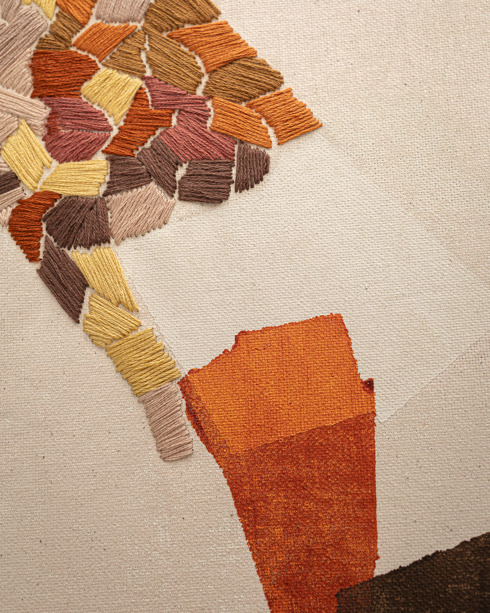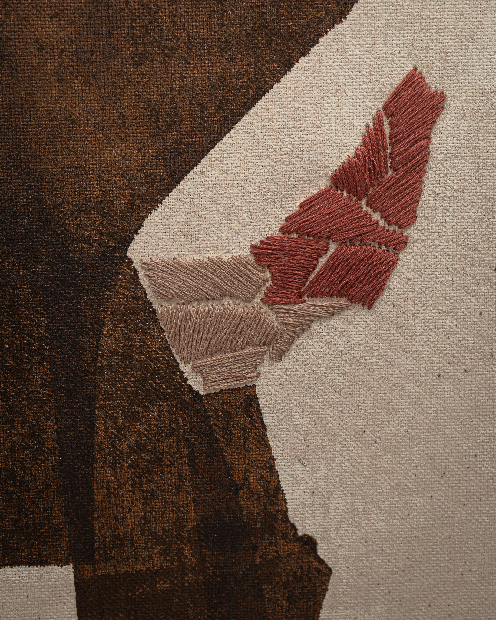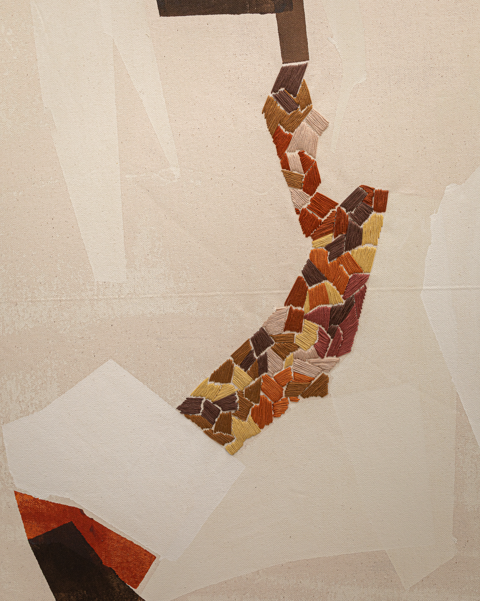 Tinta acrílica, têmpera vinílica e bordados com fios de algodão sobre linho esticado em grade de madeira.