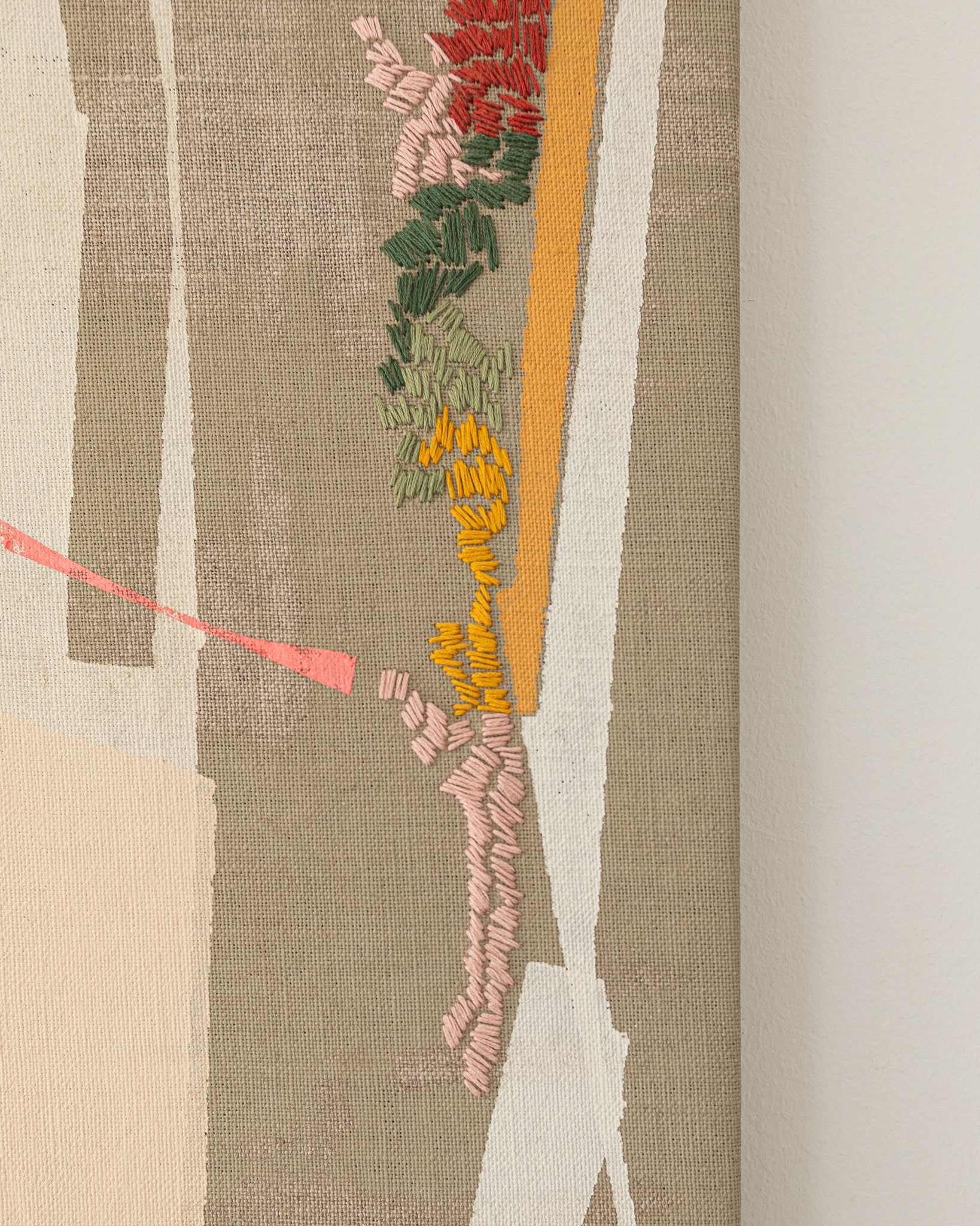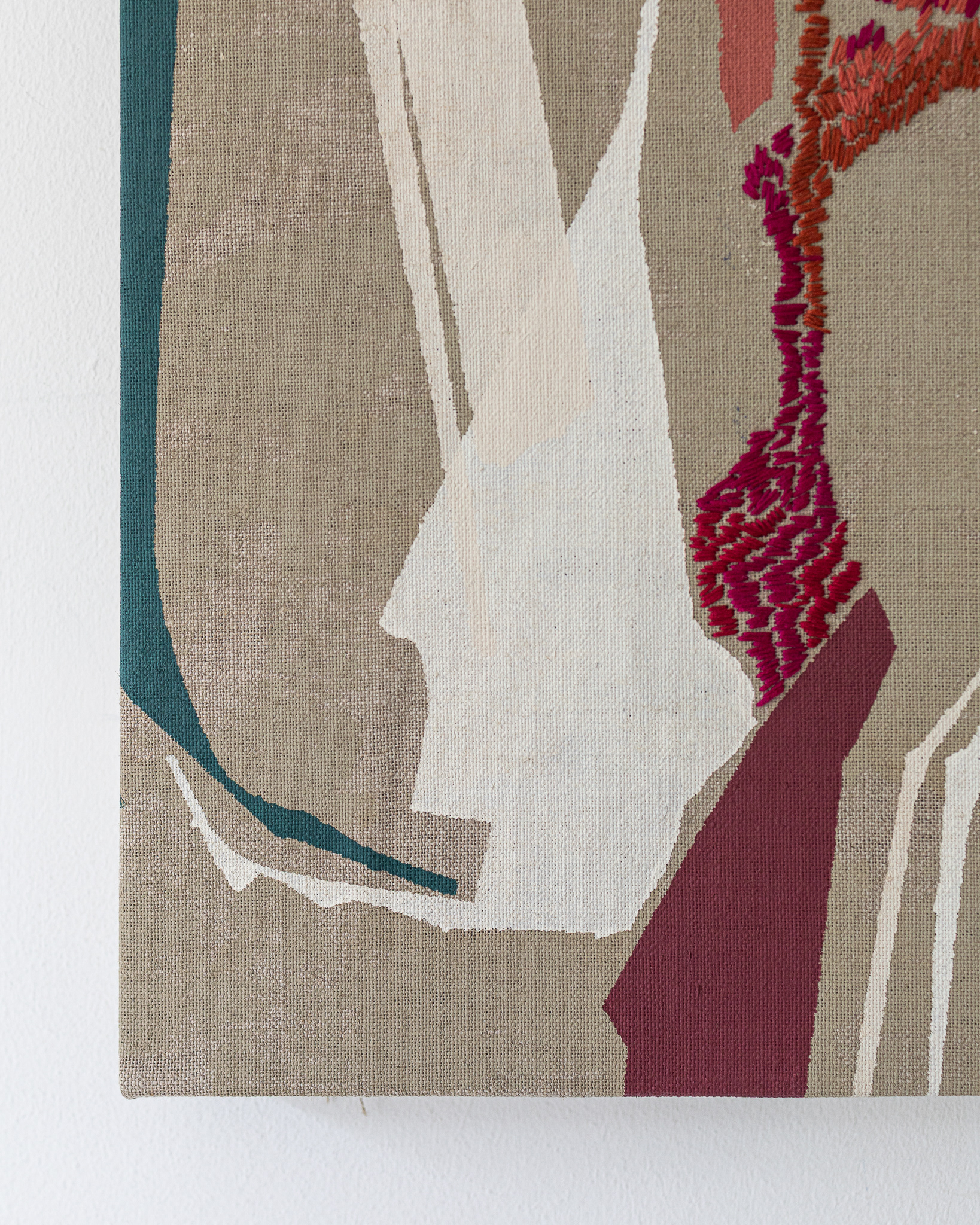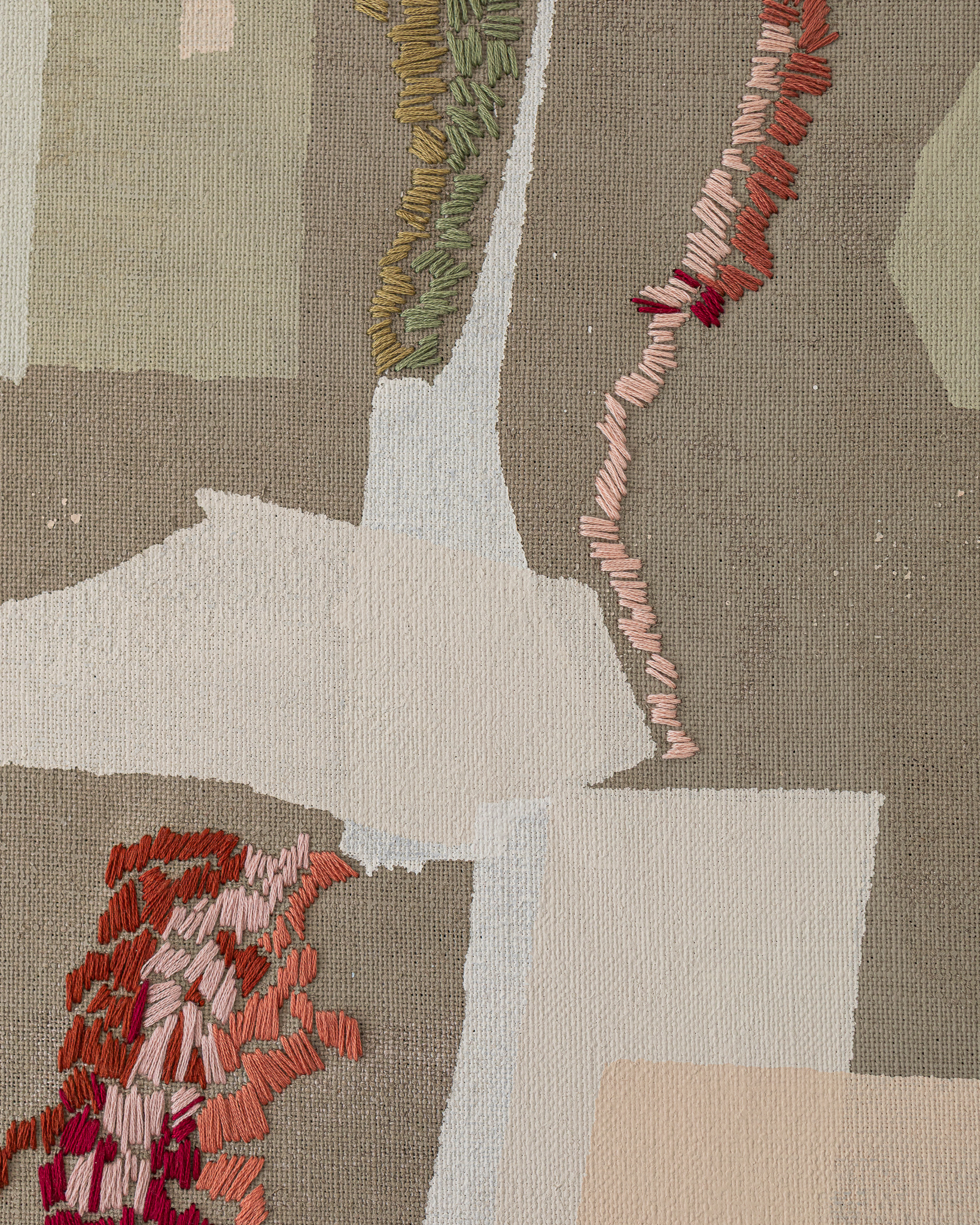 Tinta acrílica, têmpera vinílica e bordados com fios de algodão sobre linho esticado em grade de madeira.