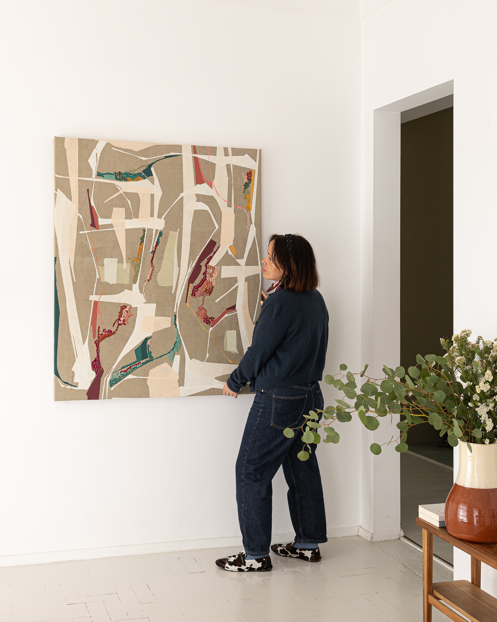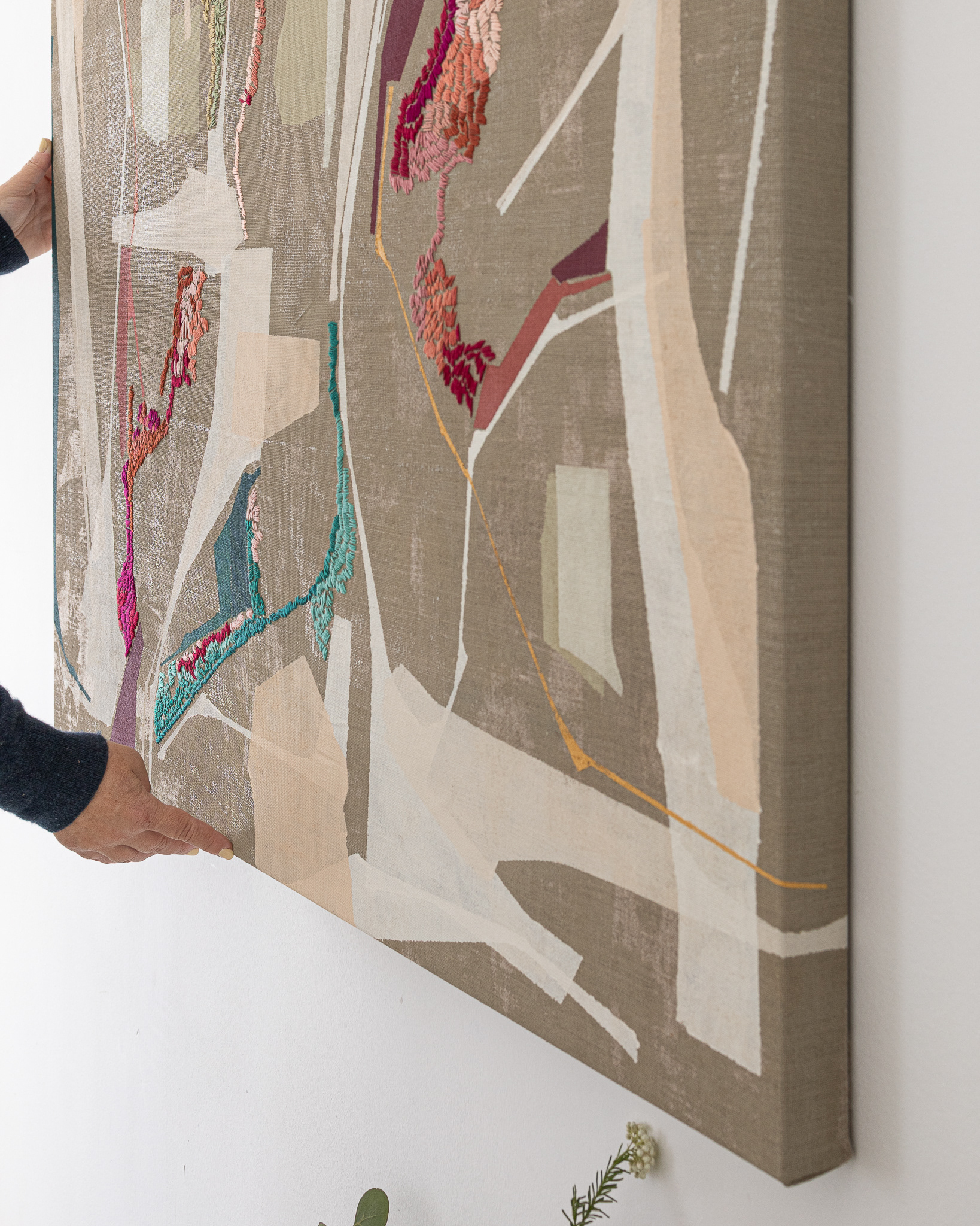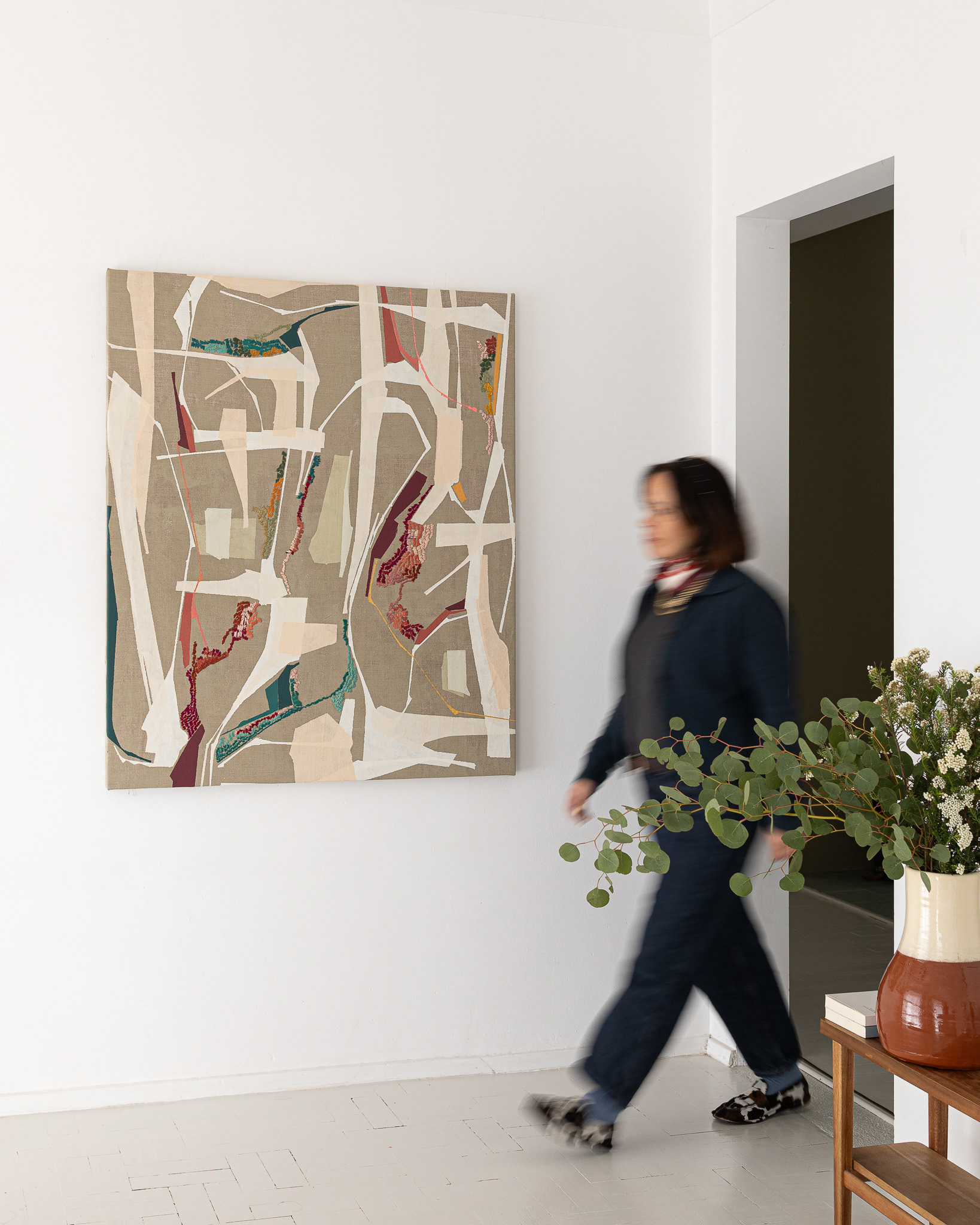 Tinta acrílica, têmpera vinílica e bordados com fios de algodão sobre linho esticado em grade de madeira.