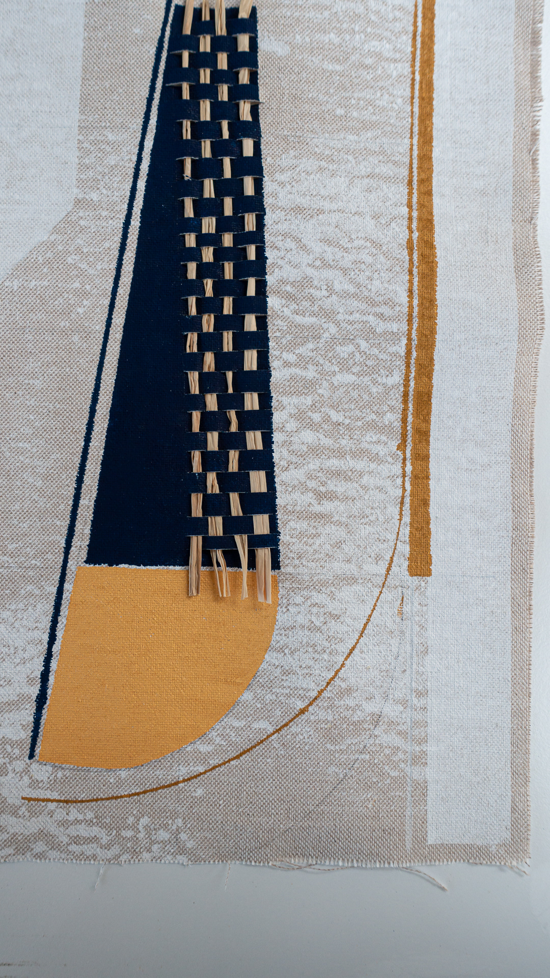 Tinta acrílica, tempera vinílica, gesso, lápis de carvão e ráfia natural sobre estopa de linho