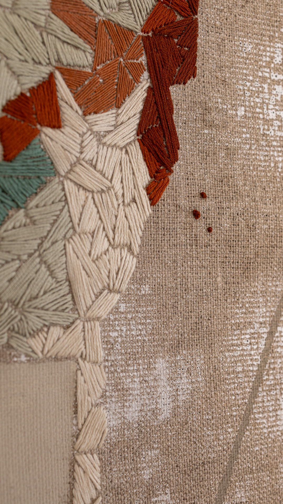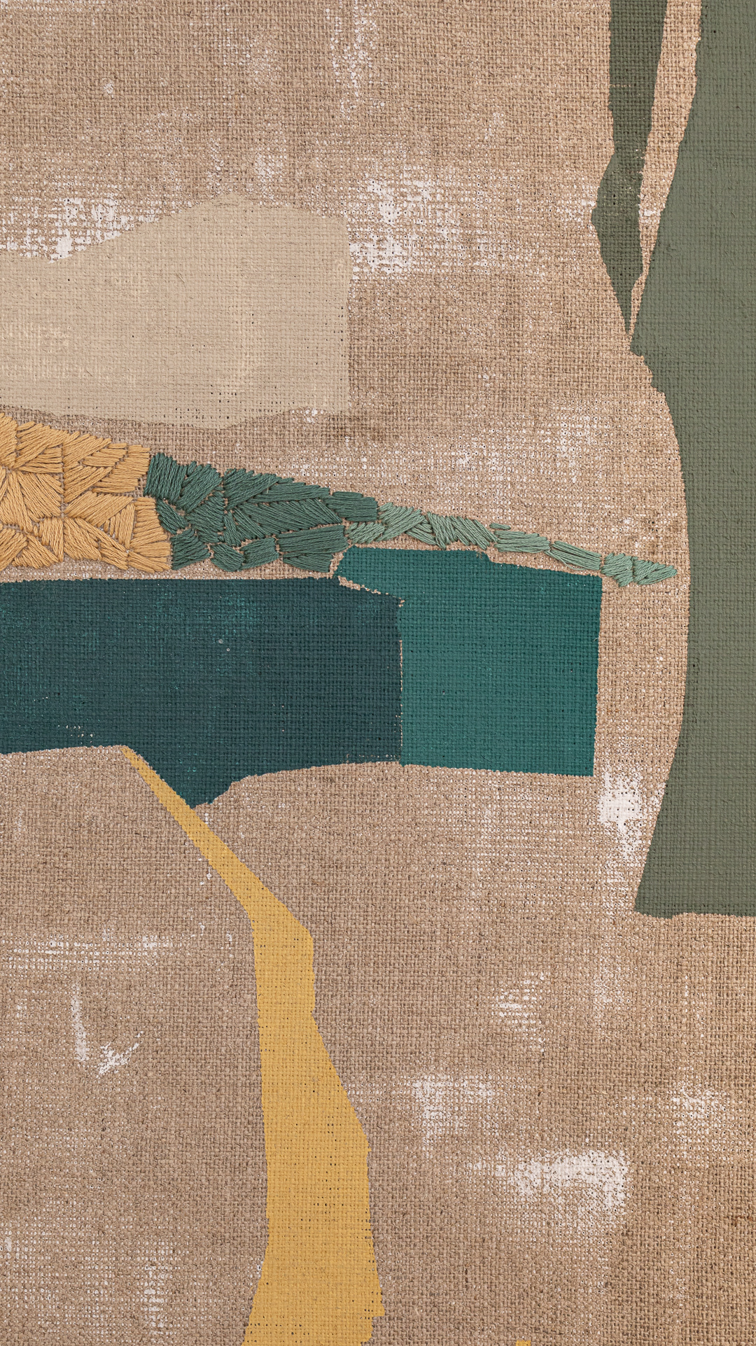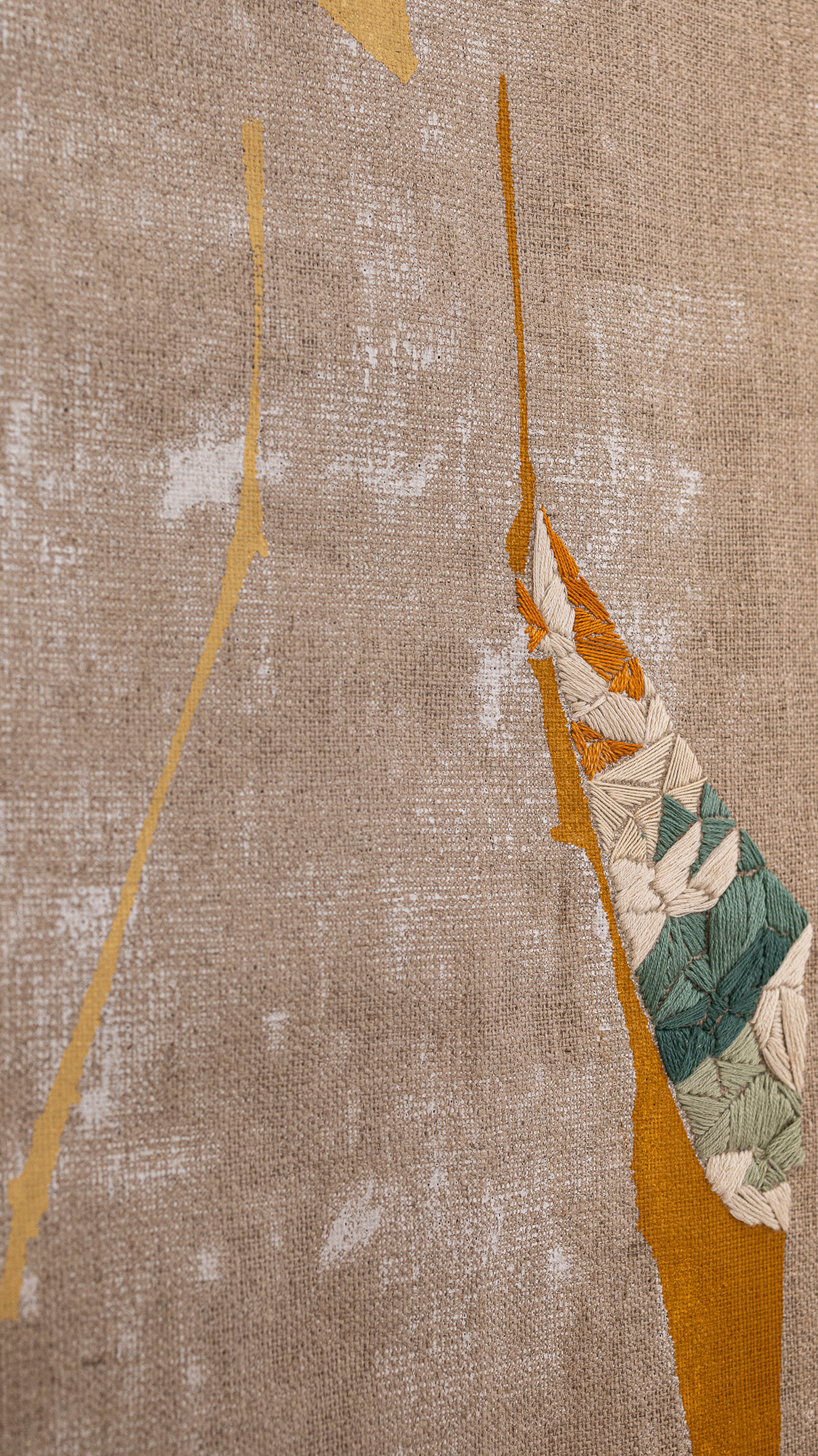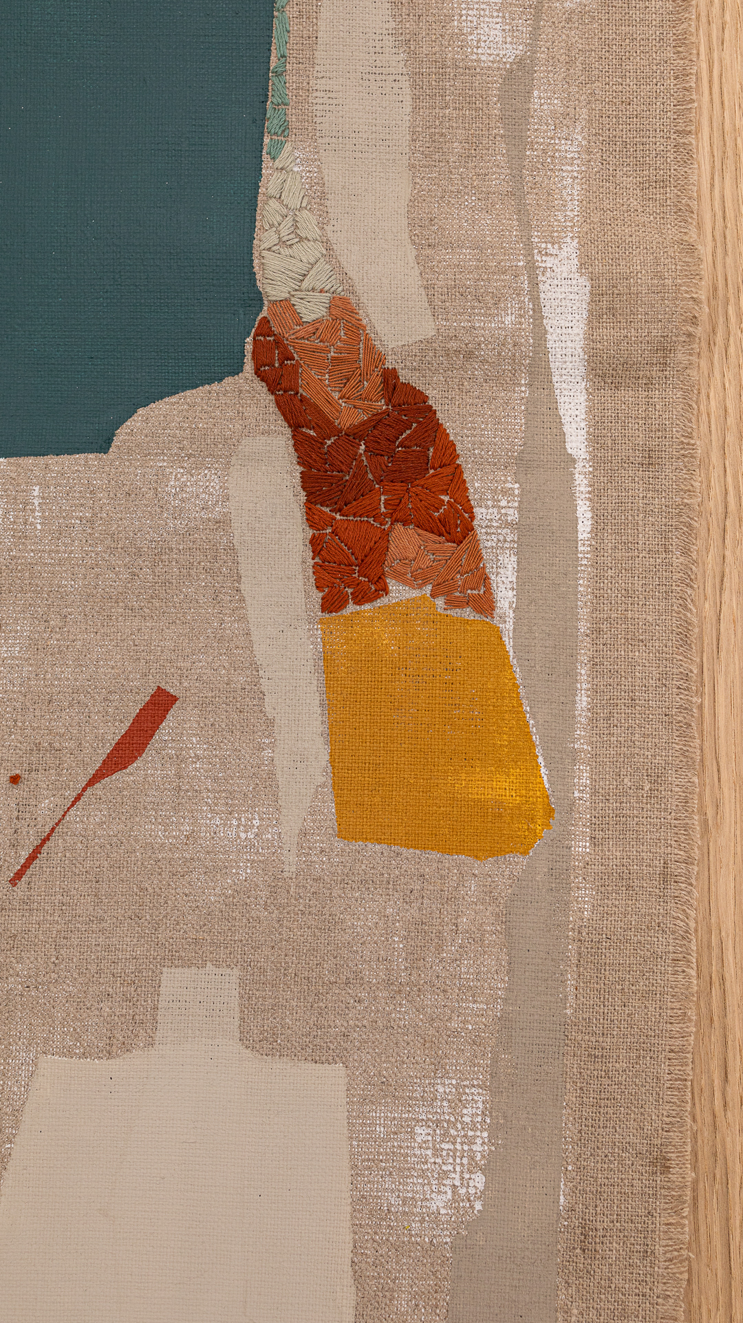 Tinta acrílica, têmpera vinílica e bordados com fios de algodão sobre linho.