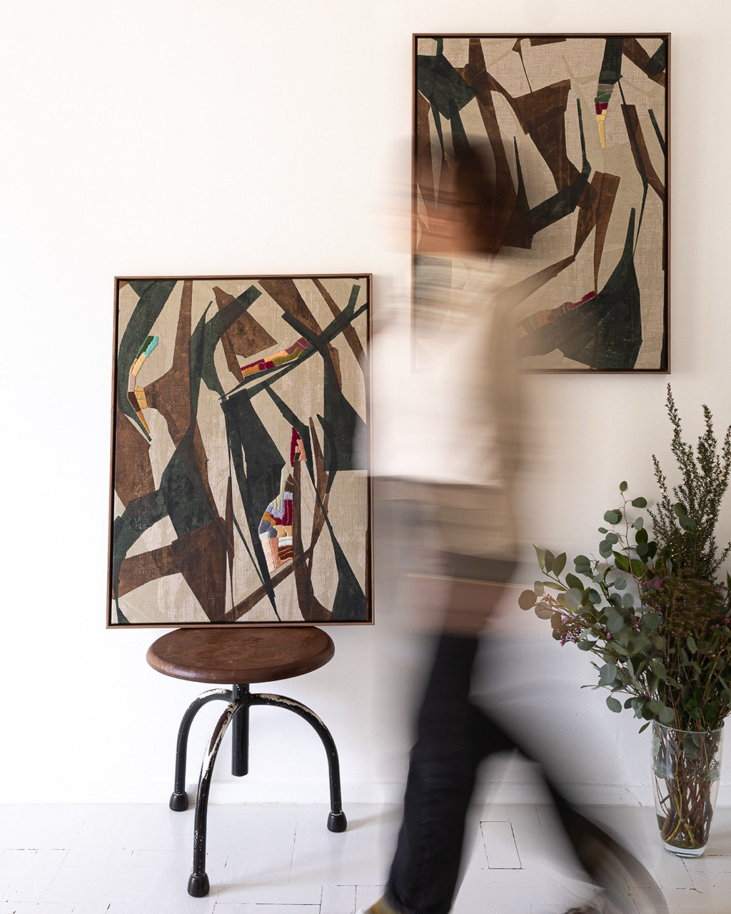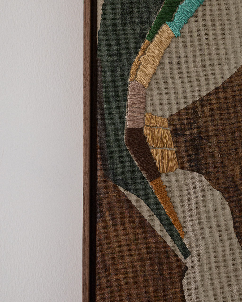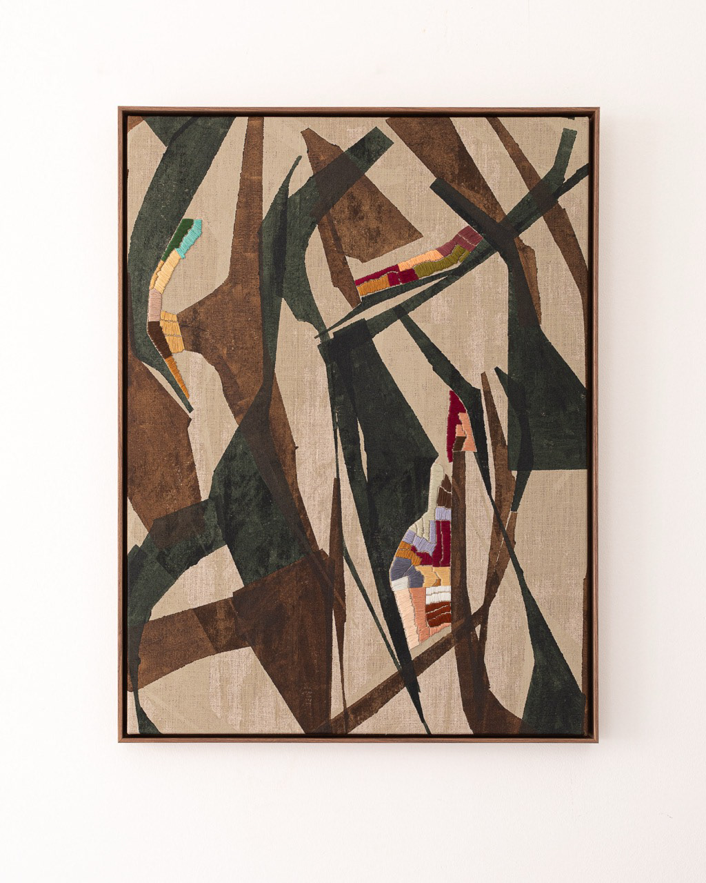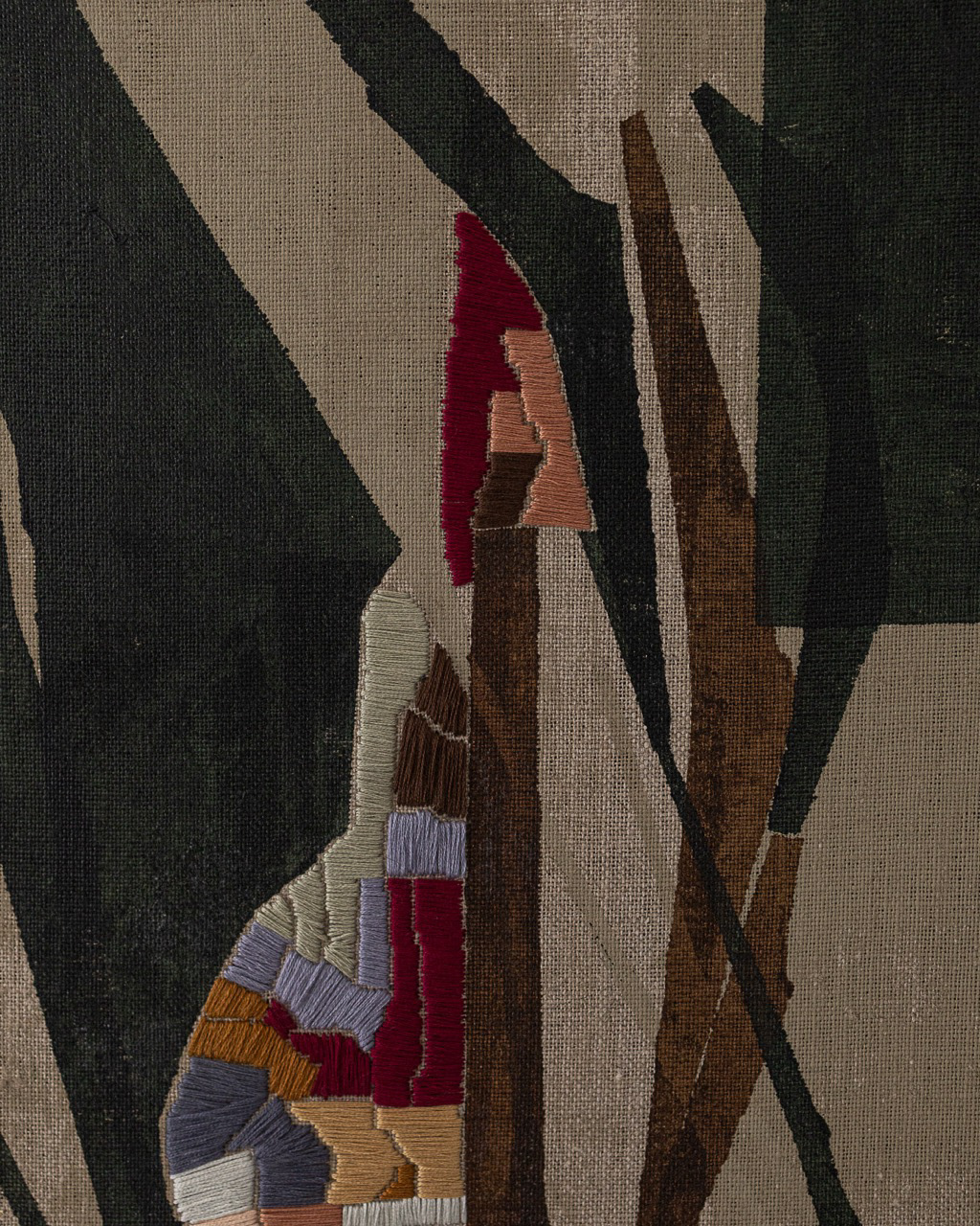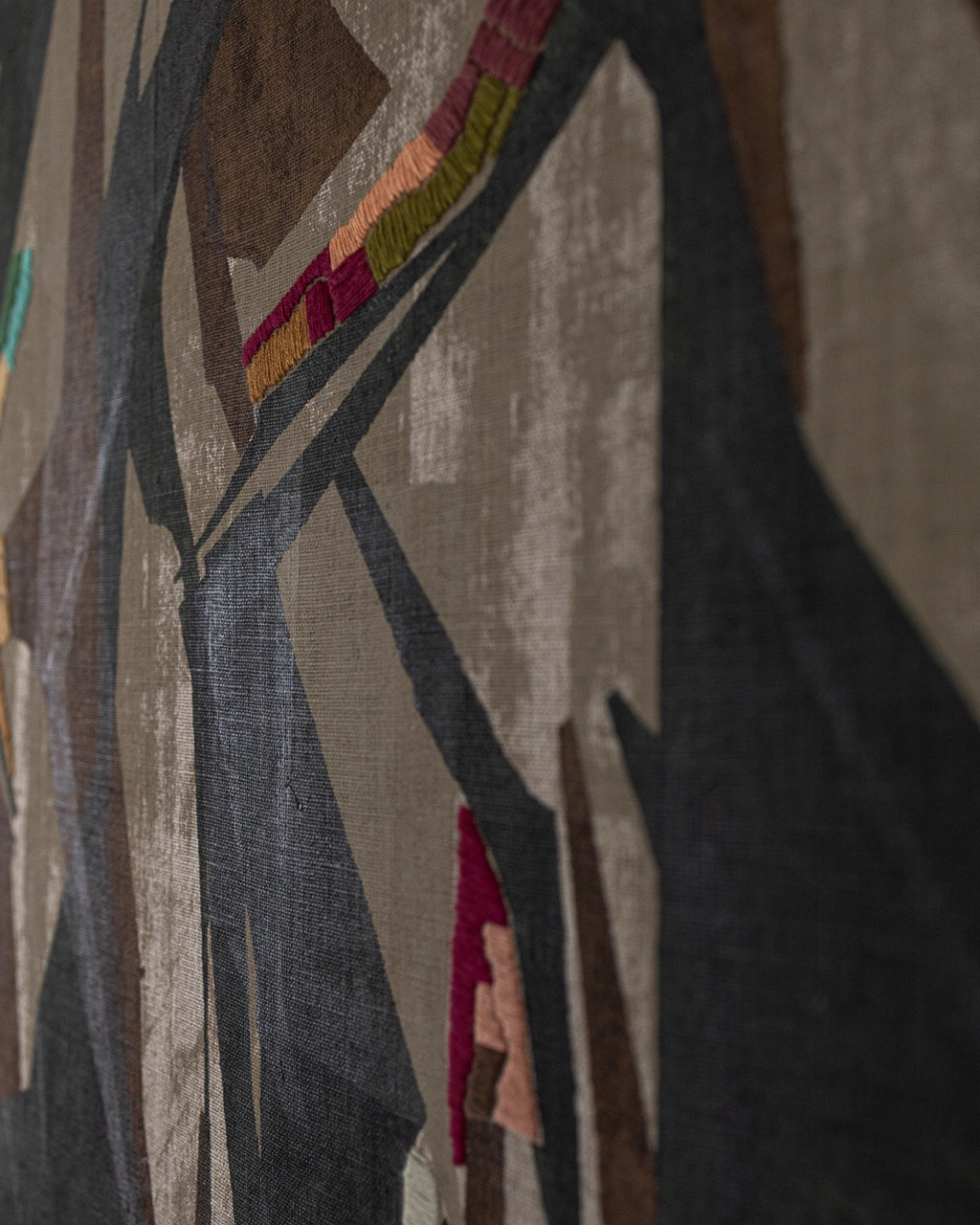 60cm x 80cm Tinta acrílica, têmpera vinílica e bordados com fios de algodão sobre linho esticado em grade de madeira. Peça única, assinada e entregue com certificado de autenticidade. Com moldura