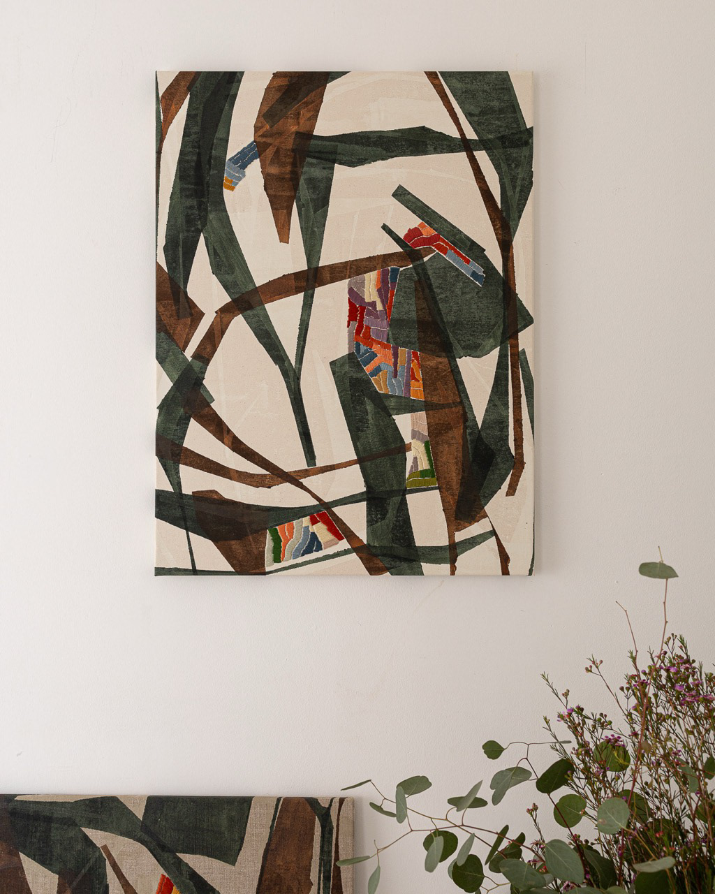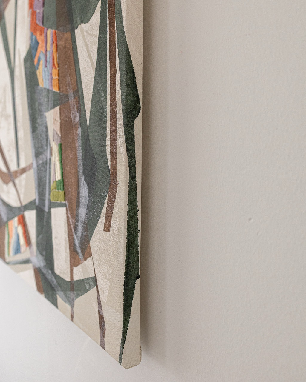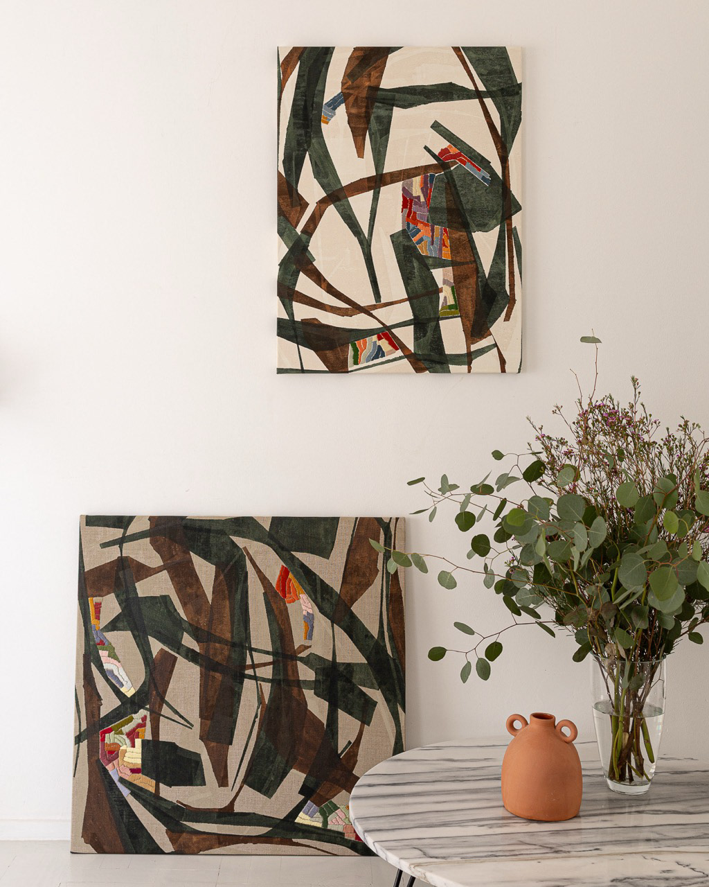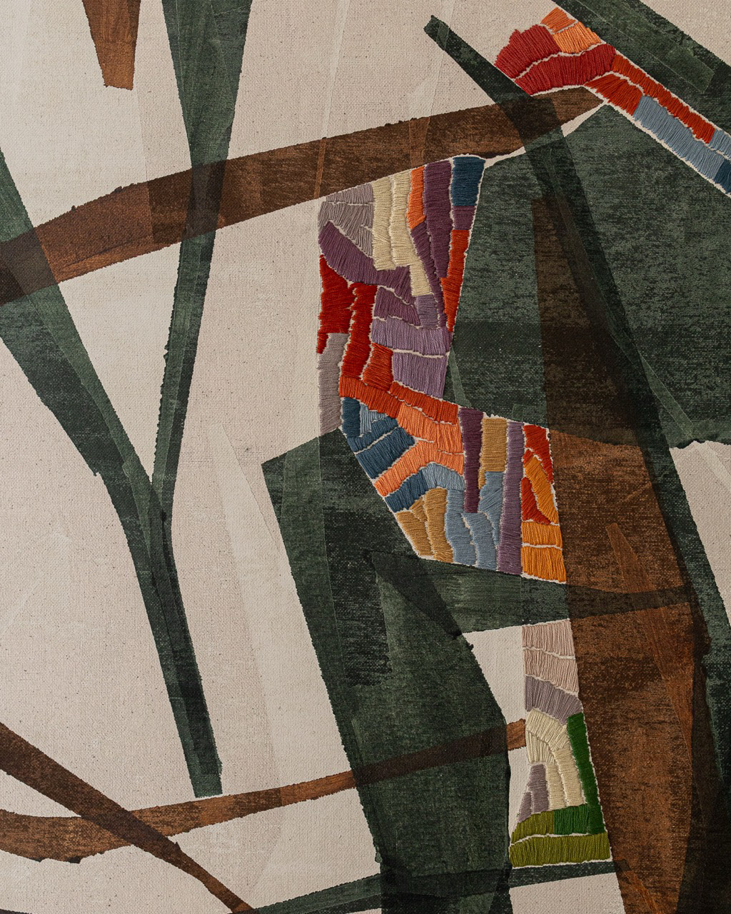 60cm x 80cm Tinta acrílica, têmpera vinílica e bordados com fios de algodão sobre estopa de algodão esticado em grade de madeira. Peça única, assinada e entregue com certificado de autenticidade.