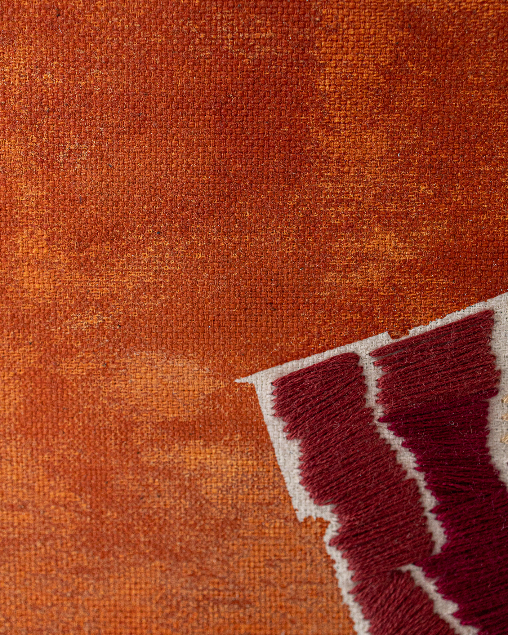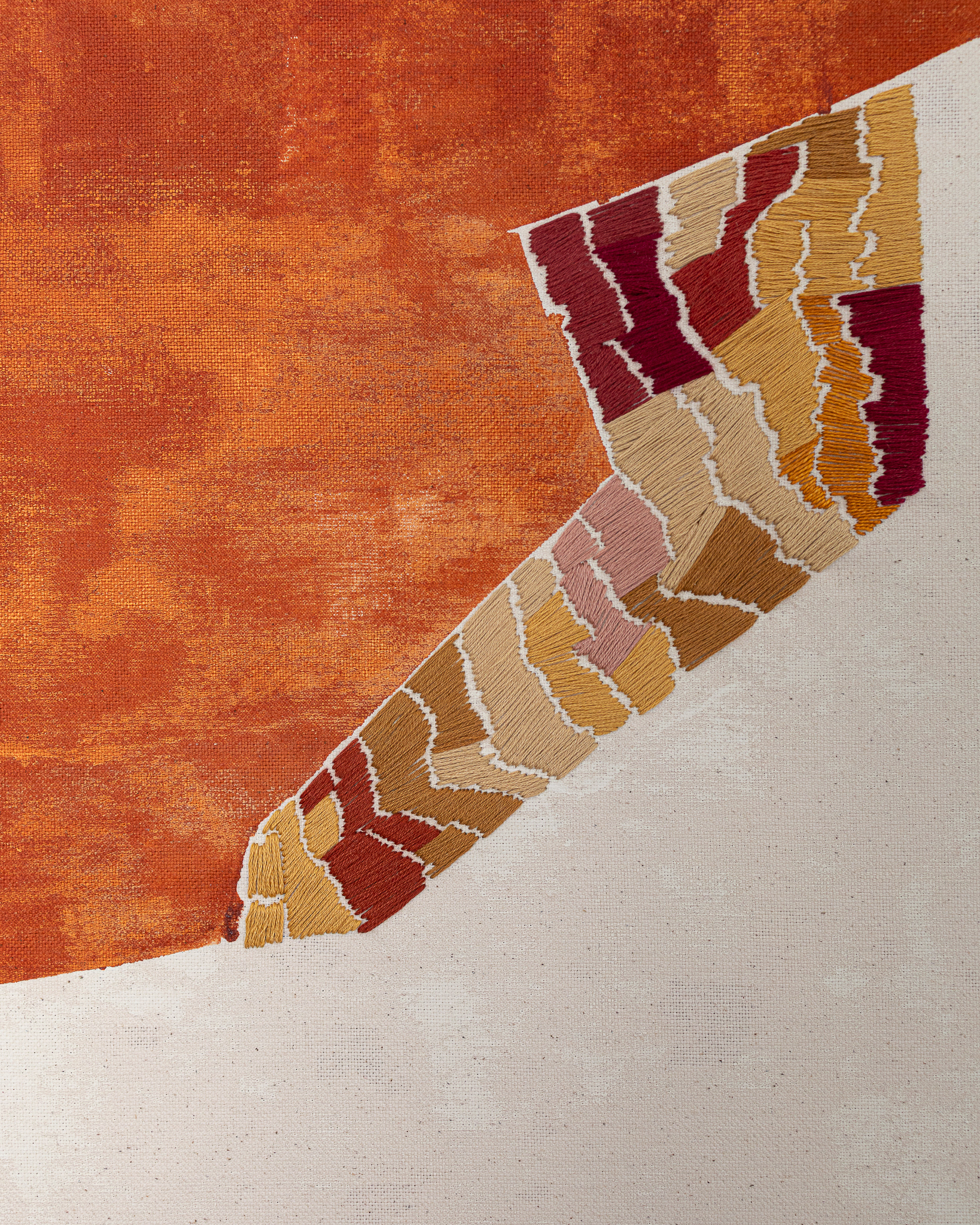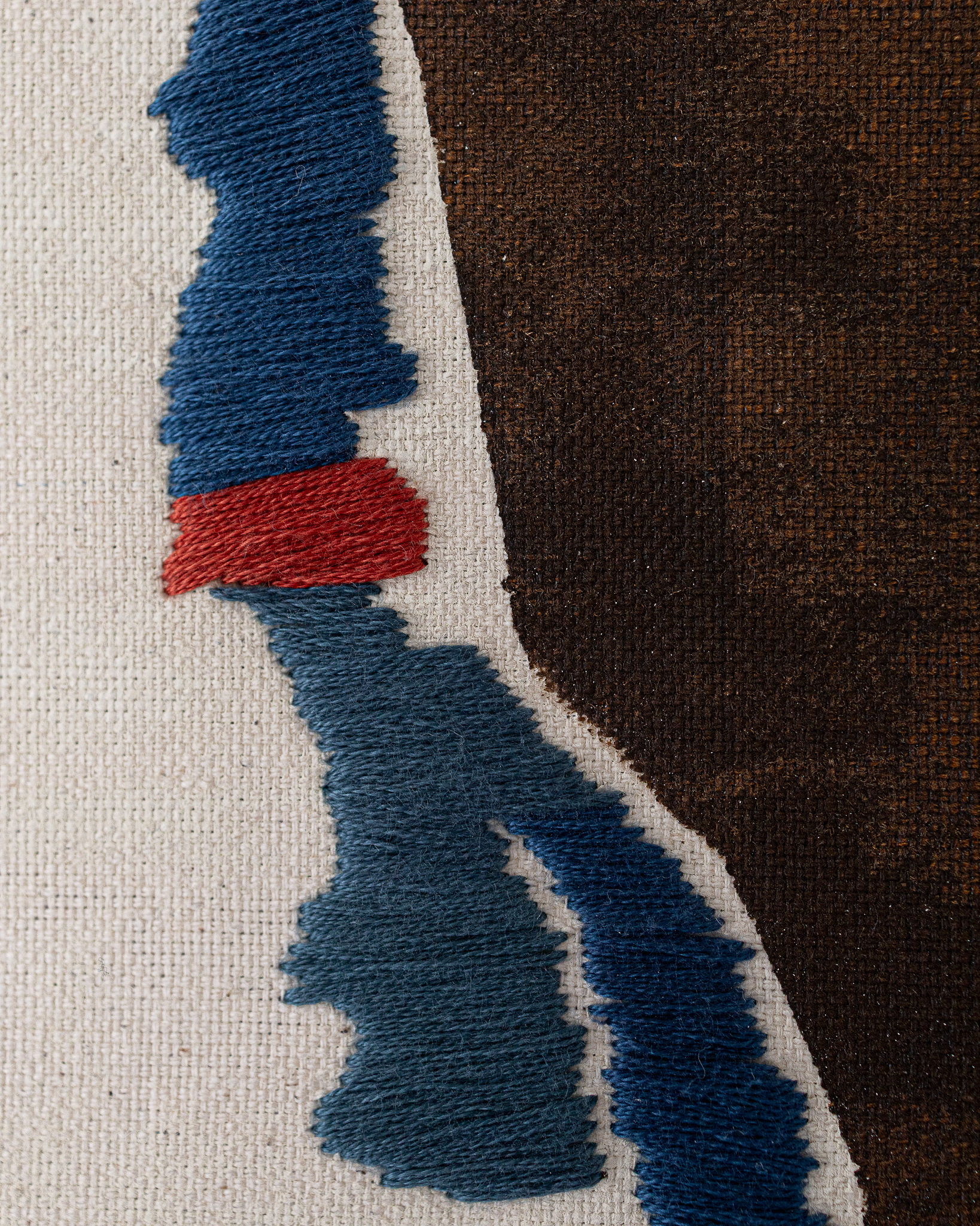 Tinta acrílica, verniz acrílico e bordados com fios de algodão sobre estopa de algodão esticada em grade de madeira